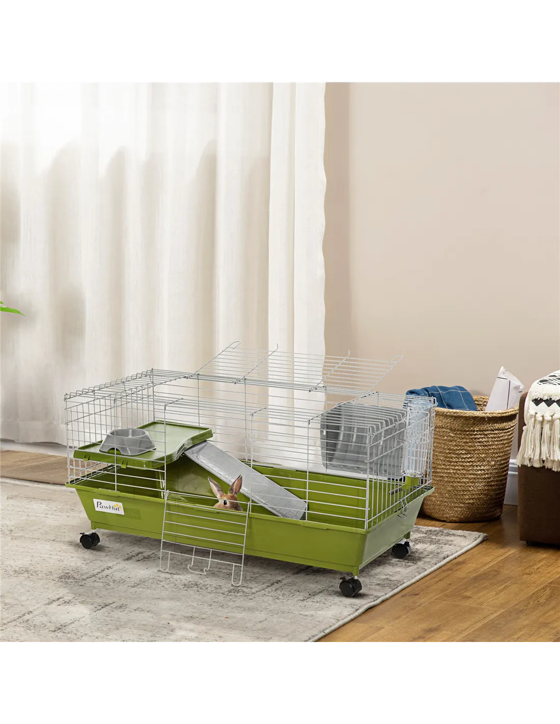 PawHut Small Animal Cage Rabbit Guinea Pigs Chinchillas Cage w/ Wheels Water Bottle Food Dish Platform Ramp 89 x 44 x 43 cm Green