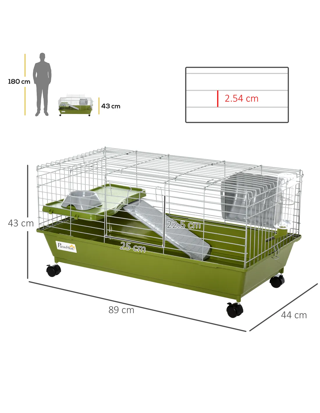 - Dimensions: 43H x 89L x 44Wcm. Front door: 22.5H x 25Wcm. Top door: 54.5L x 25Wcm. Plastic tray: 14H x 86L x 42Wcm. Platform: 45L x 25Wcm. Ramp: 40L x 13Wcm. Food dish: 4.5H x 13L x 13Wcm. Water bottle: 26H x Φ6cm