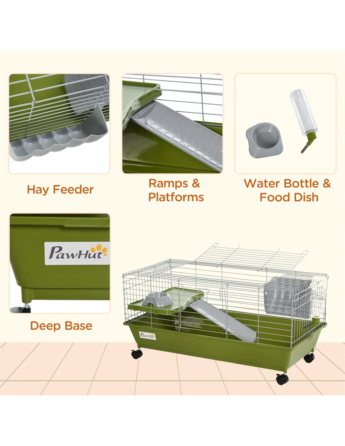 - Features a platform with ramp, a hay feeder, water bottle and food dish