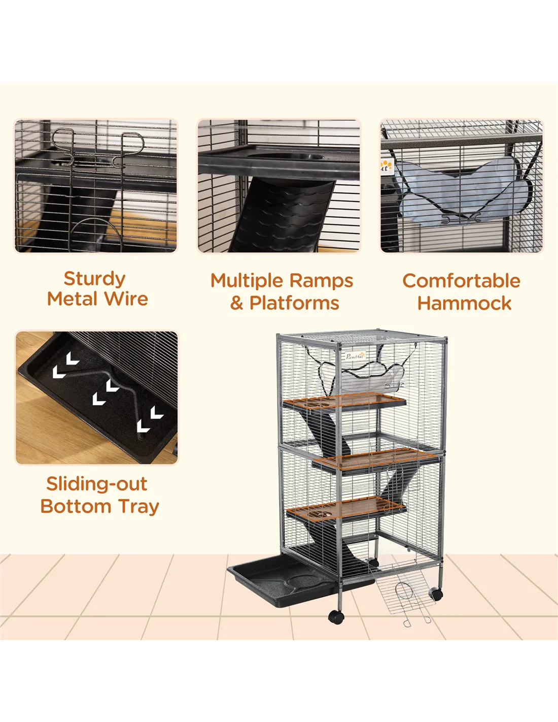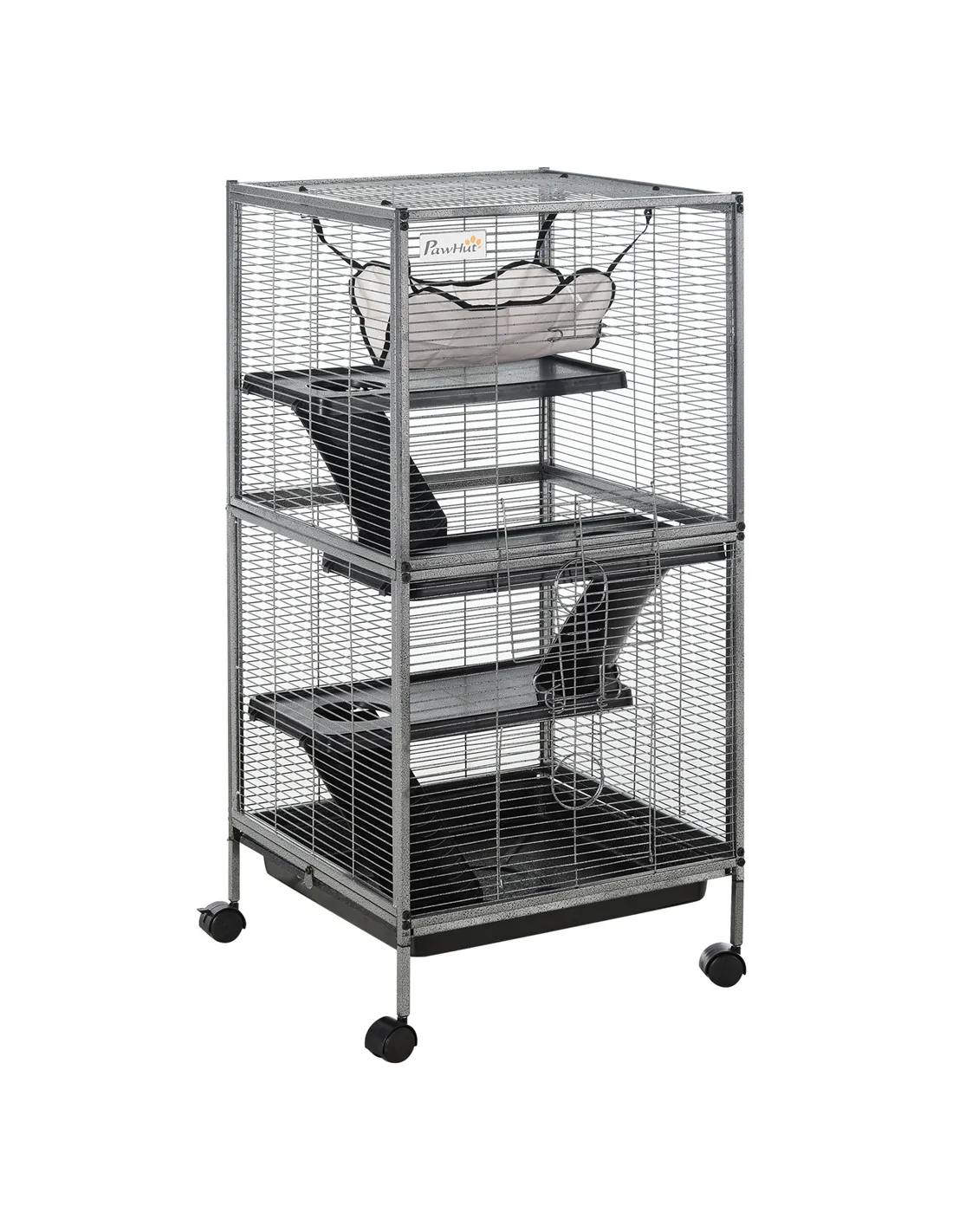 Pets love to roam and explore – with this spacious PawHut animal cage, they'll enjoy a roomy and secure home. Four levels, connected by ramps, so pets can run around freely. To relax, they'll lay on the snug hammock at the top. Resting on four wheels, the cage can move around, whilst the multiple doors give easy access inside. There's a tray at the bottom for catching litter, which is removable for effortless cleaning, keeping their space tidy. A stable home for small pets to thrive.