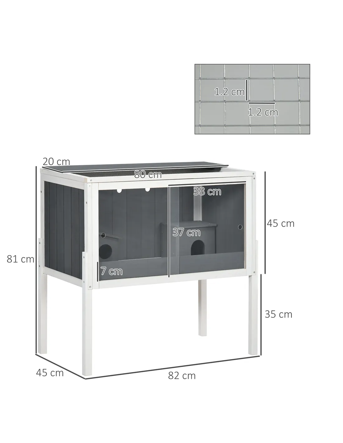 The PawHut wooden enclosure offers a versatile habitat for small pets such as dwarf hamsters, gerbils, and rutin chickens. Its spacious interior, featuring two cosy huts and a movable shelf, allows your pets to explore, rest, and play comfortably. Ideal for placement in living rooms, bedrooms, or conservatories, this cage blends seamlessly with home décor thanks to its stylish grey finish. The water-resistant wooden frame ensures durability both indoors and in sheltered outdoor areas. Use the top shelf to keep pet essentials close at hand, making daily care effortless. Thanks to the transparent sliding acrylic doors, you can easily monitor your pets’ activity without disturbance, enhancing your bonding experience.