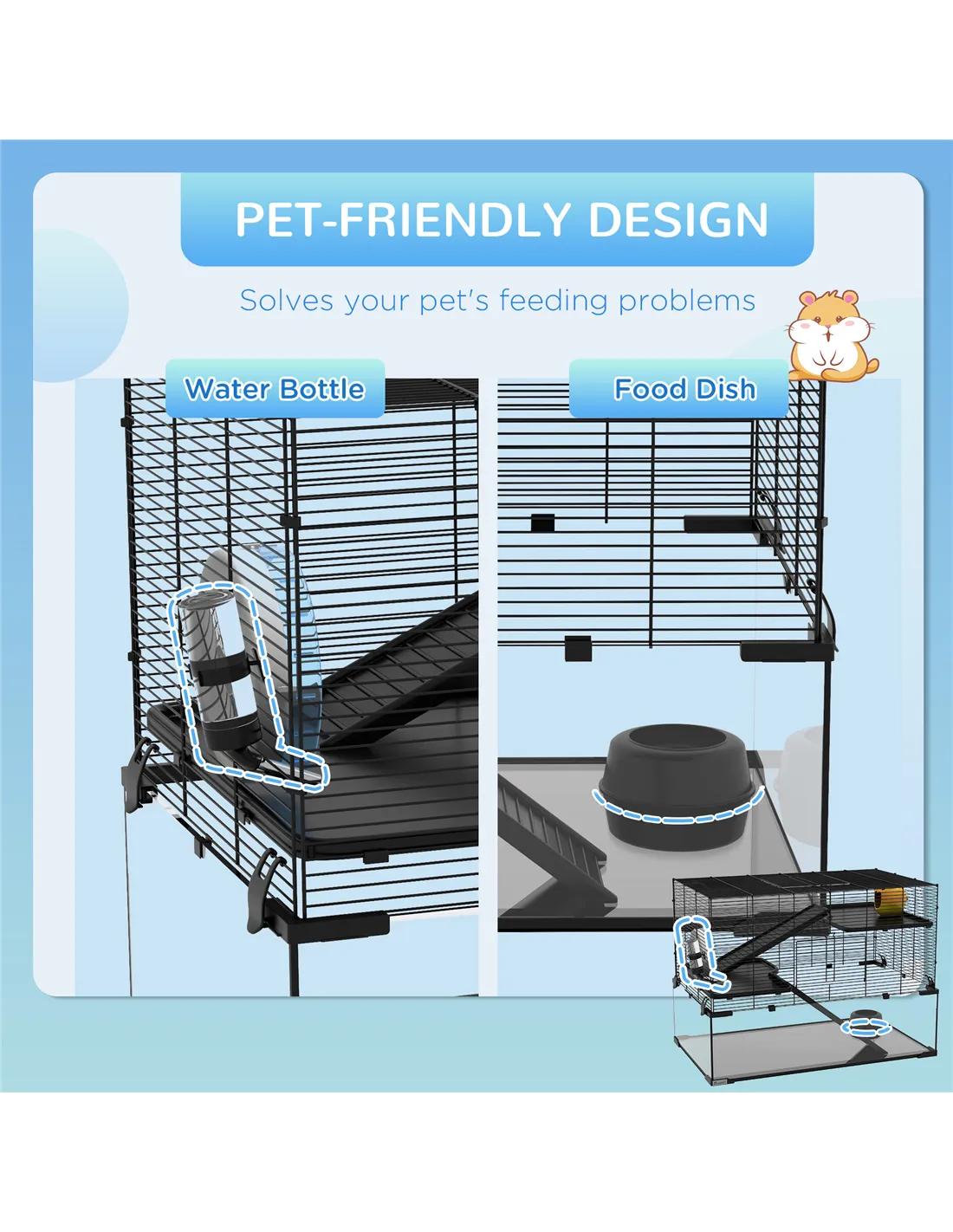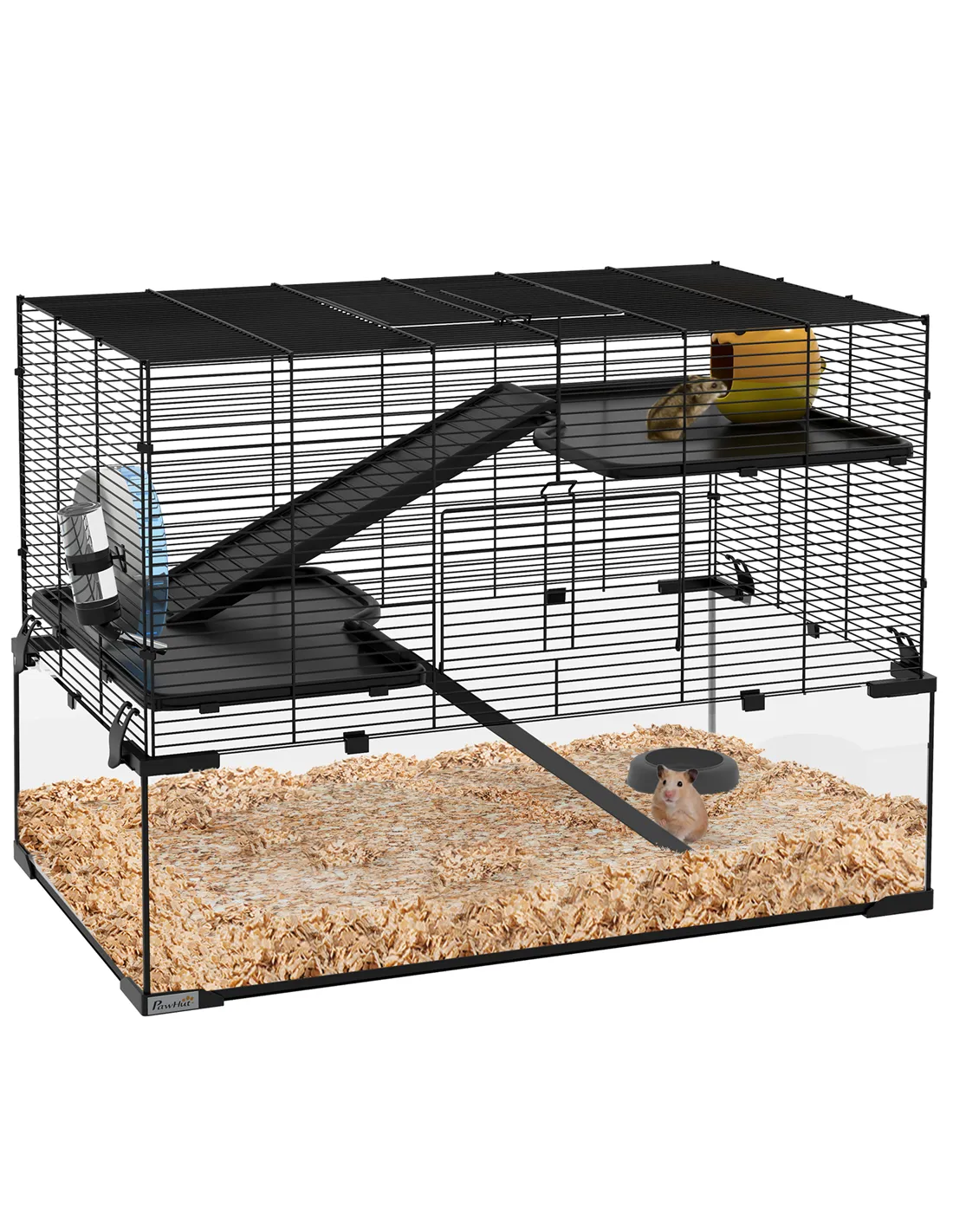 This PawHut hamster cage for dwarf hamster provides a spacious, multi-level home for pets, with an included running wheel and ramps for exercise and play. A private, cosy hut offers a place to relax, whilst an accessible food bowl and water bottle keep them fed and hydrated. The tempered glass base with footpads ensures safety and security, whilst the spaced wiring promotes airflow, keeping them cool and cosy. Invest in your pets' comfort and happiness by treating the to the ideal living space.