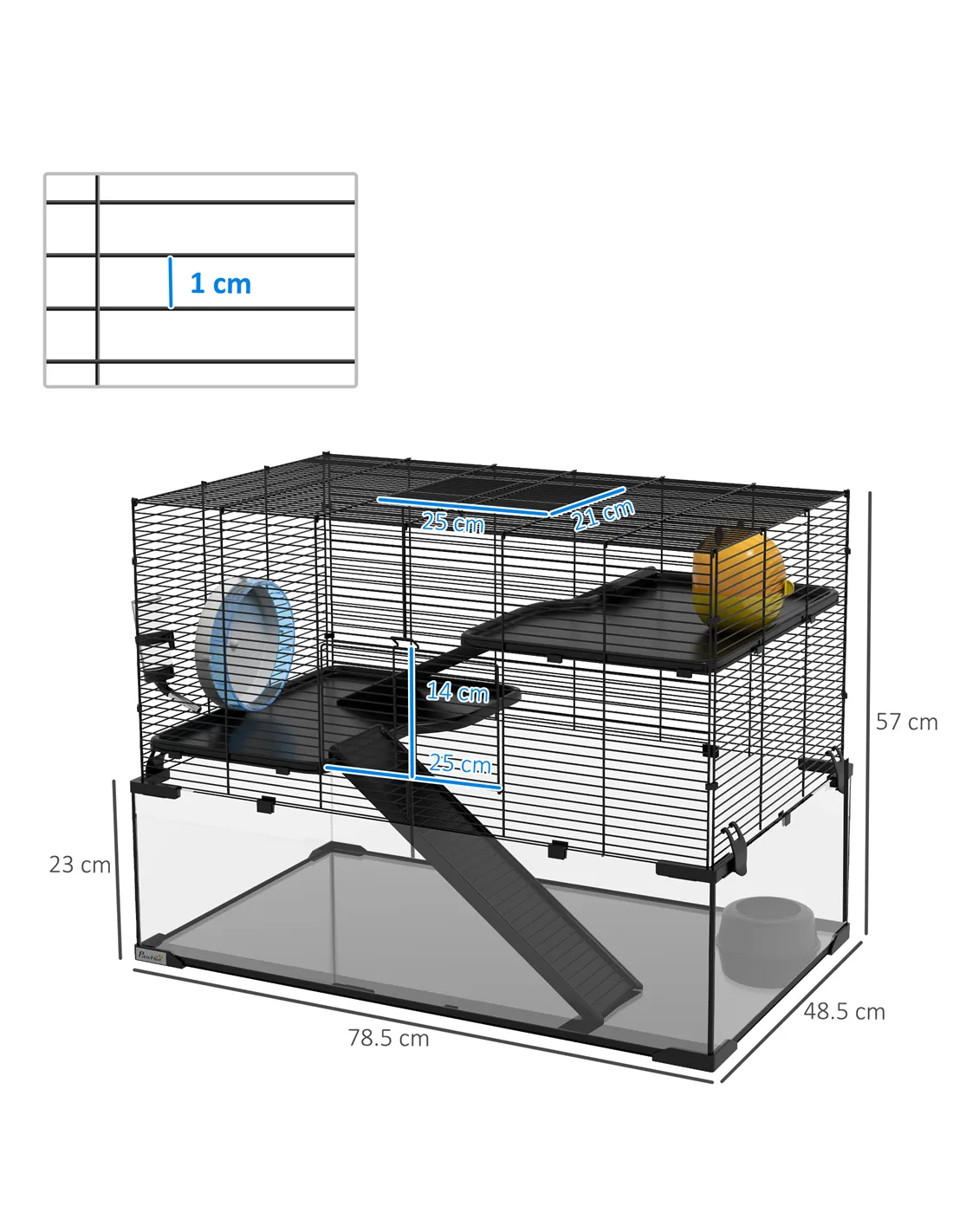 - Dimensions: 54.5H x 78.5L x 48.5Wcm. Glass base: 23H x 78.5L x 48.5Wcm. Main cage: 35H x 77.5L x 46Wcm. Door: 14H x 25Wcm. Top: 21H x 25Wcm. Layer: 46L x 30Wcm. Ramp: 42.5L x 14Wcm. Exercise wheel: 6.5H x Φ16.5cm. Hut: 12H x 12L x 10Wcm. Food dish: 4.5H x Φ13cm. Wire distance: 10mm