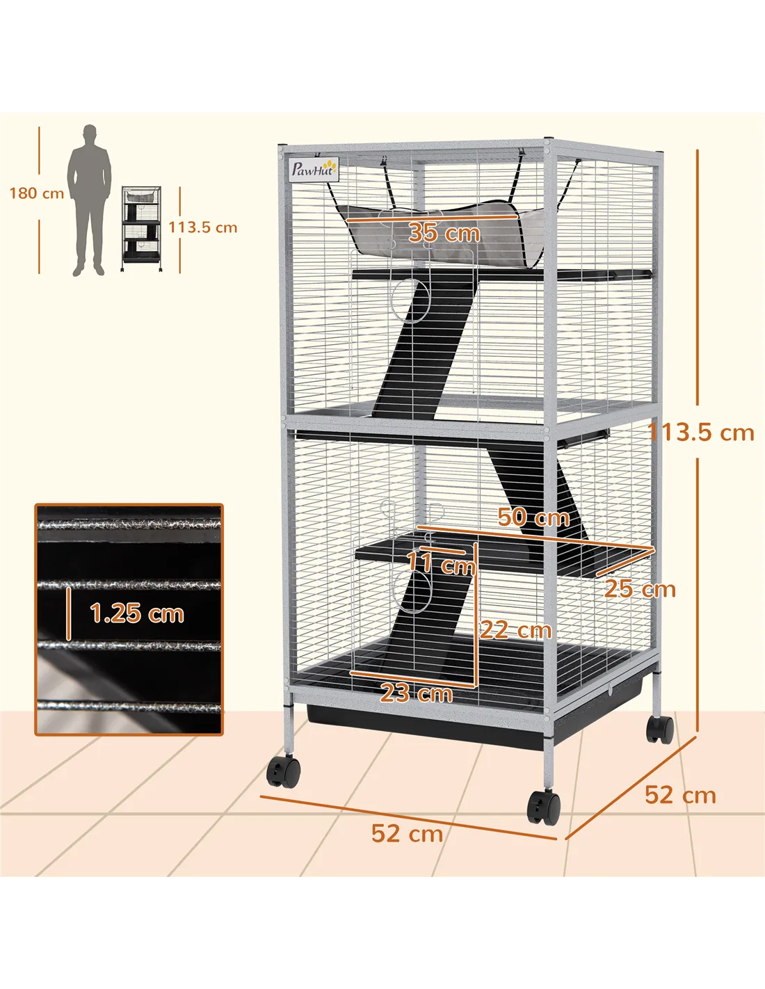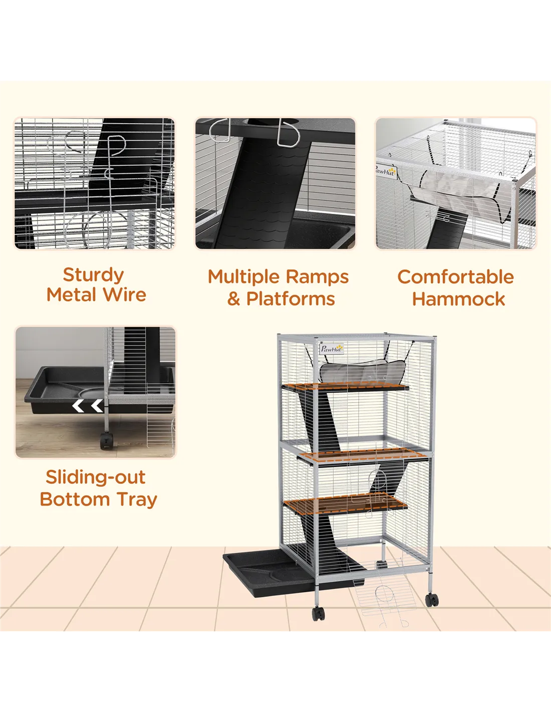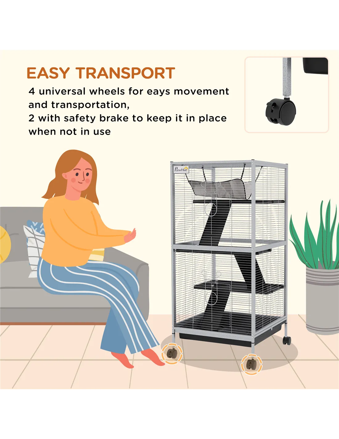 Pets love to roam and explore – with this spacious PawHut animal cage, they'll enjoy a roomy and secure home. Four levels, connected by ramps, so pets can run around freely. To relax, they'll lay on the snug hammock at the top. Resting on four wheels, the cage can move around, whilst the multiple doors give easy access inside. There's a tray at the bottom for catching litter, which is removable for effortless cleaning, keeping their space tidy. A stable home for small pets to thrive.
