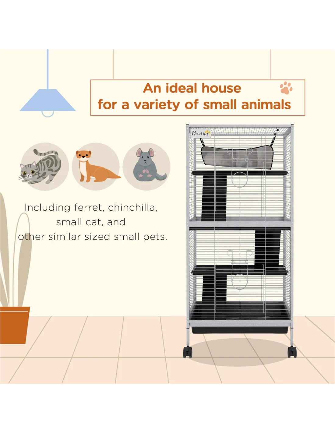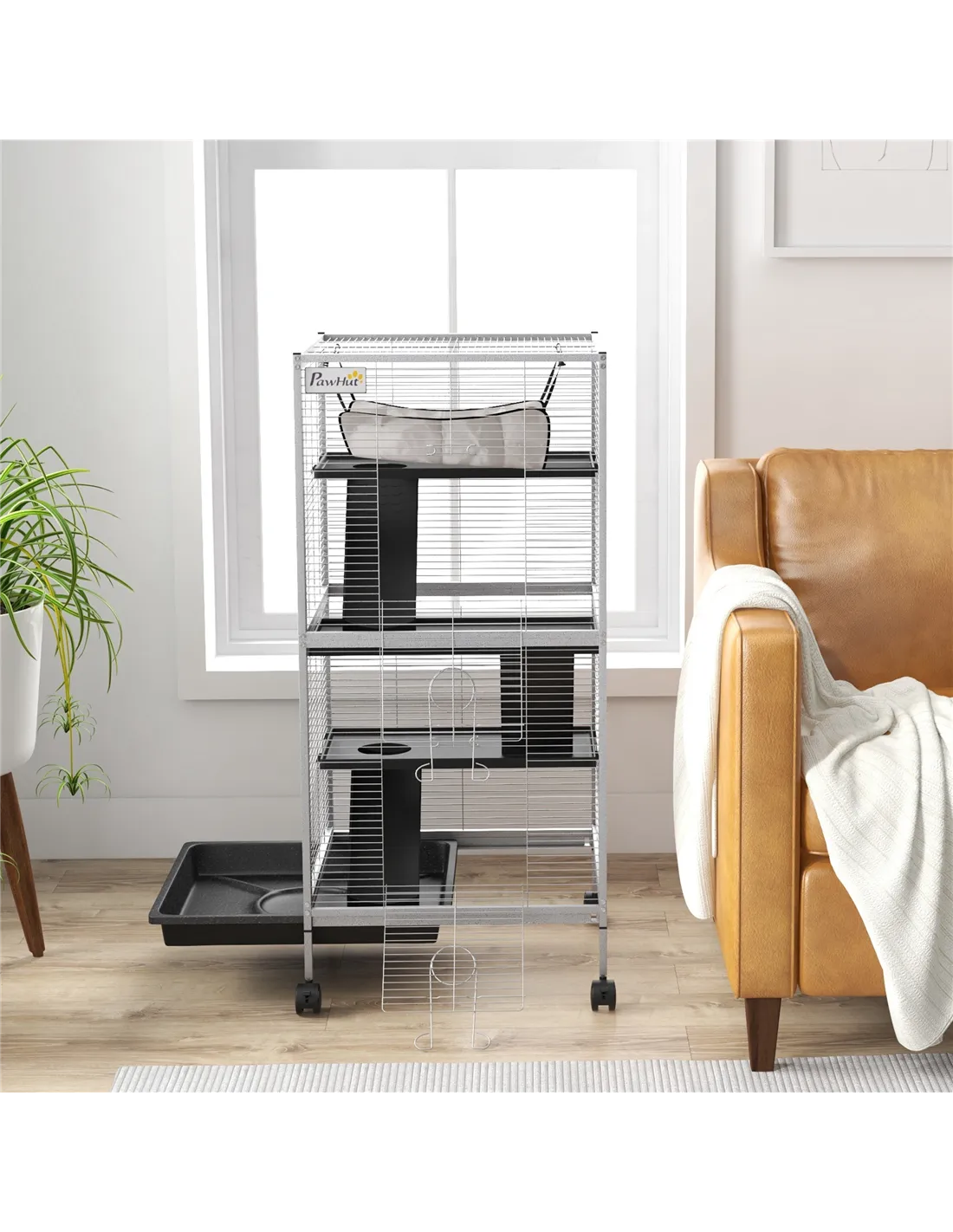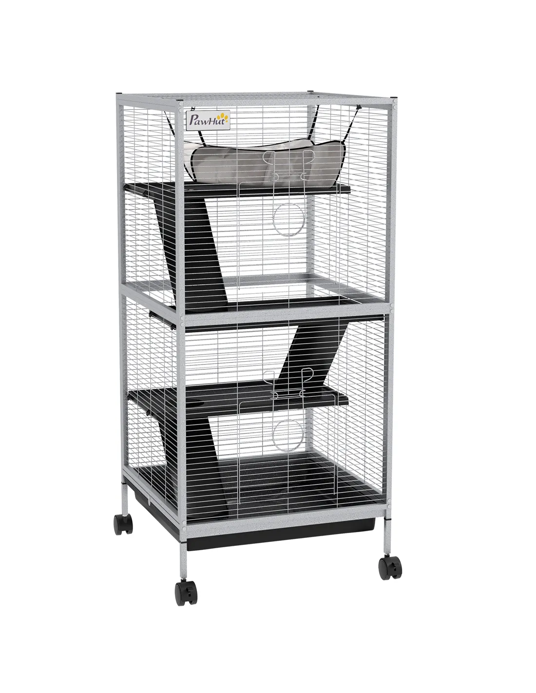 Pets love to roam and explore – with this spacious PawHut animal cage, they'll enjoy a roomy and secure home. Four levels, connected by ramps, so pets can run around freely. To relax, they'll lay on the snug hammock at the top. Resting on four wheels, the cage can move around, whilst the multiple doors give easy access inside. There's a tray at the bottom for catching litter, which is removable for effortless cleaning, keeping their space tidy. A stable home for small pets to thrive.