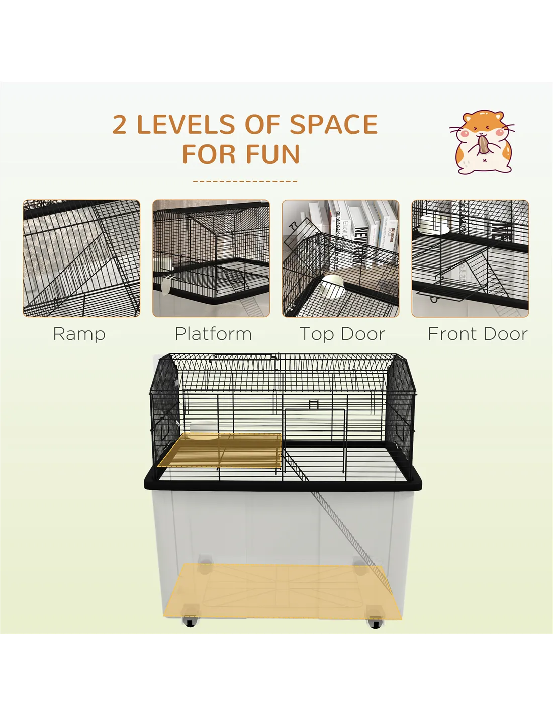 A large and wonderful haven for small pets to thrive in - the PawHut hamster cage. Consisting of two levels, connected by a ramp, they have an abundance of space to roam, scatter and stay active. The food dish and water bottle ensure they never go hungry or parched. It has built-in wheels at the bottom, so you can move it around effortlessly. Suitable for dwarf hamsters, Syrian hamsters and gerbils, it's a brilliant abode for small pets to enjoy living in.