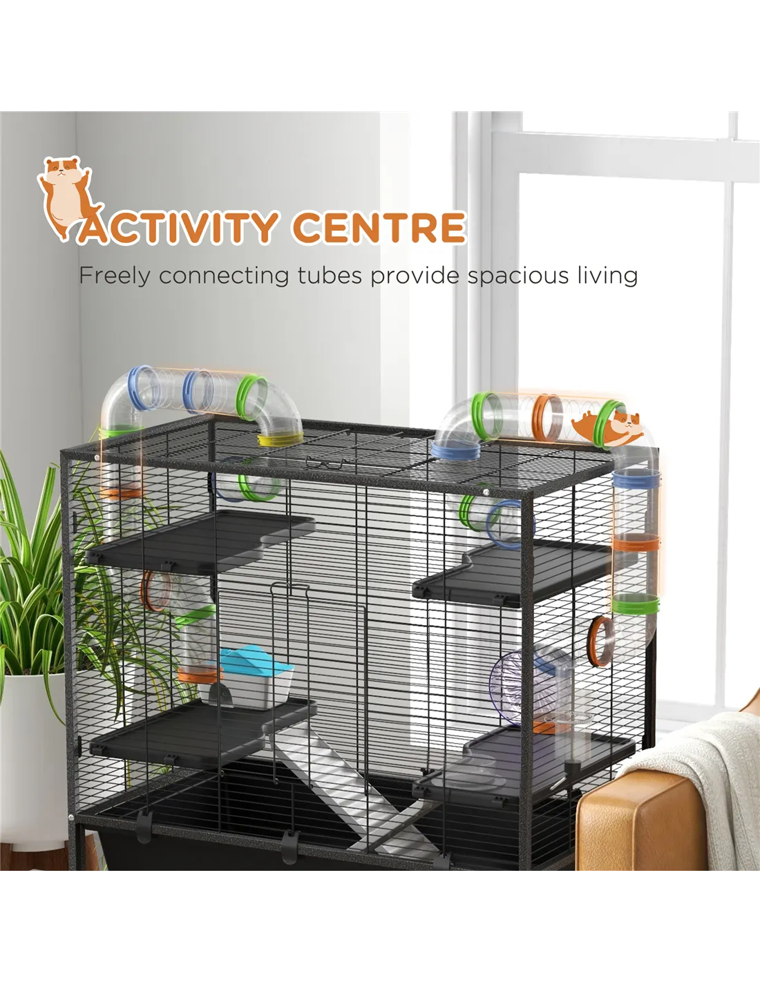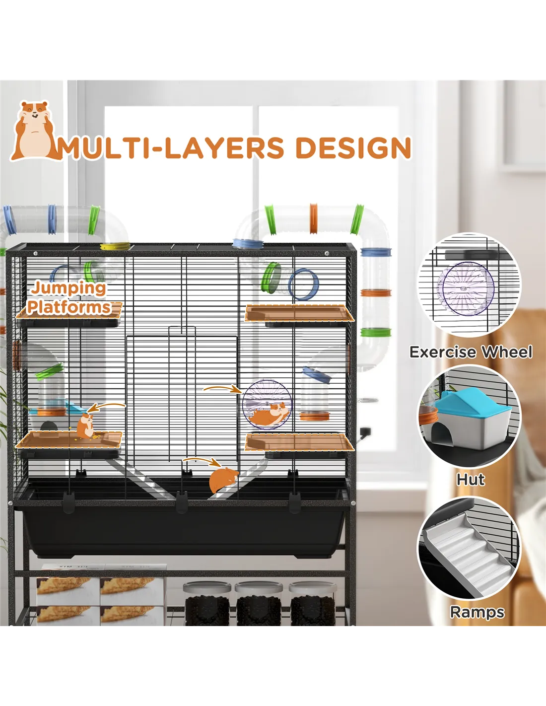 PawHut Large Hamster Cage, Gerbil Cage with Tubes, Storage Shelf, Ramps, Platforms, Running Wheel - Black