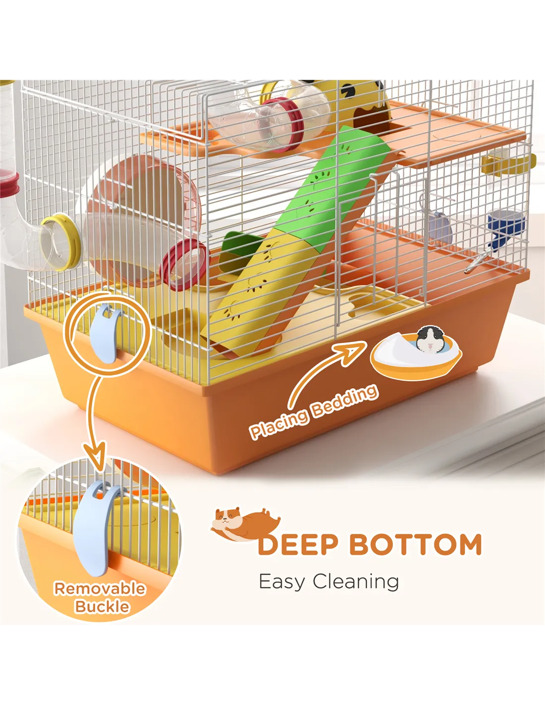 - Overall dimensions: 37H x 45L x 28Wcm. Base: 11H x 45L x 28Wcm. Front door: 12.5H x 15Wcm. Layer: 28L x 25Wcm. Ramp: 5H x 24L x 6Wcm. Hut: 7H x 12L x 10Wcm. Exercise wheel: 6.5H x Φ12.5cm. Food dish: 3.5H x 10L x 6Wcm. Water bottle: 100ml. Tube diameter: Φ5.5cm. Wire spacing: 0.9cm