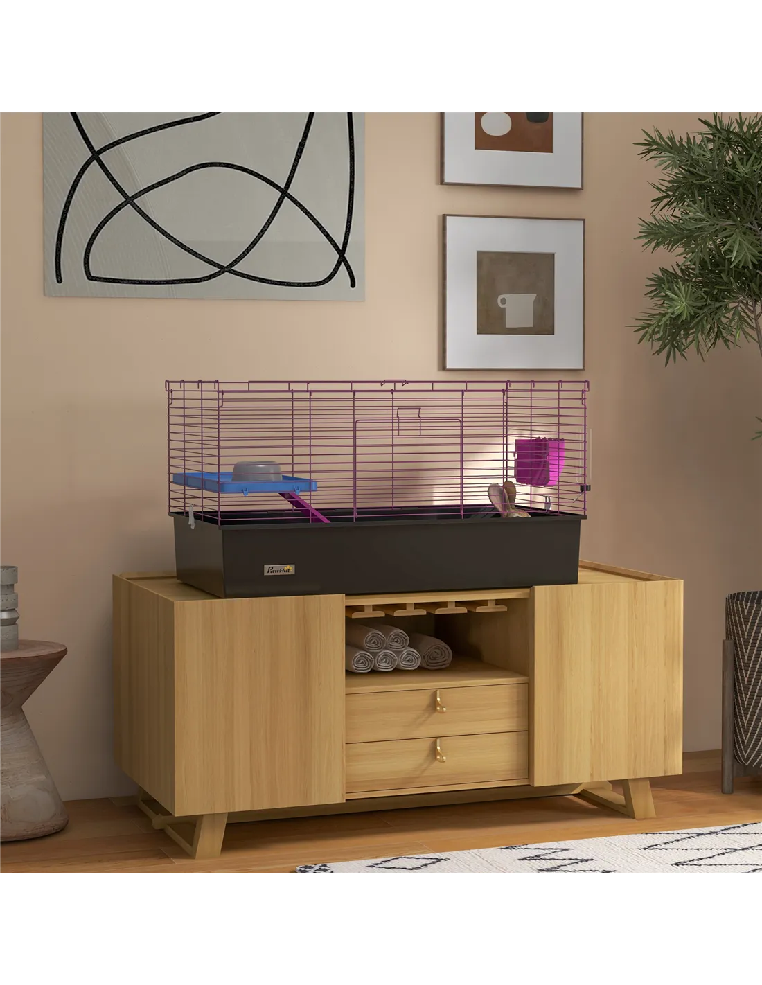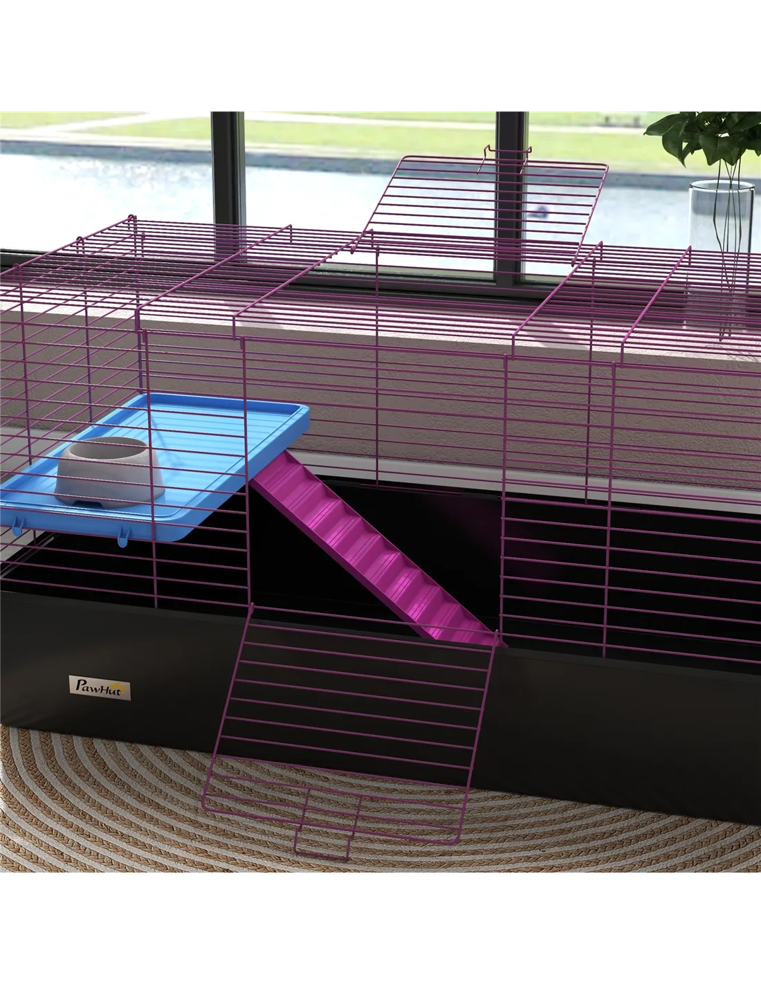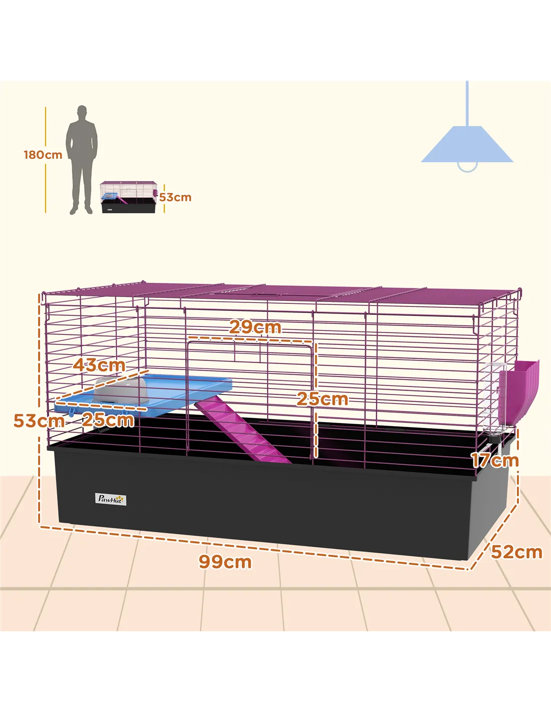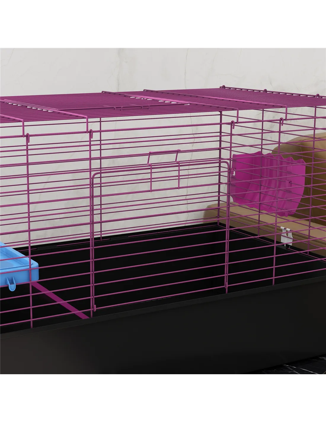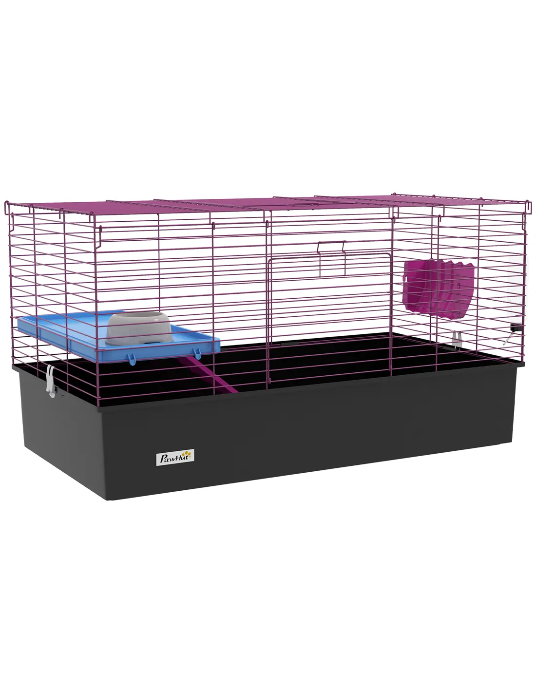 Watch pets thrive in this PawHut cage – a wonderful home for small animals. A colourful safe haven, it's made with a cosy living area, protected by metal wire caging, keeping them safely inside and allowing air to flow through. Inside features a small platform with a food bowl, a water bottle, a ramp and a hay feeder, providing everything they need. Plus, there's a deep base, which collects dirt and debris, keeping their space clean and comfortable. Give your pets the home they truly deserve.