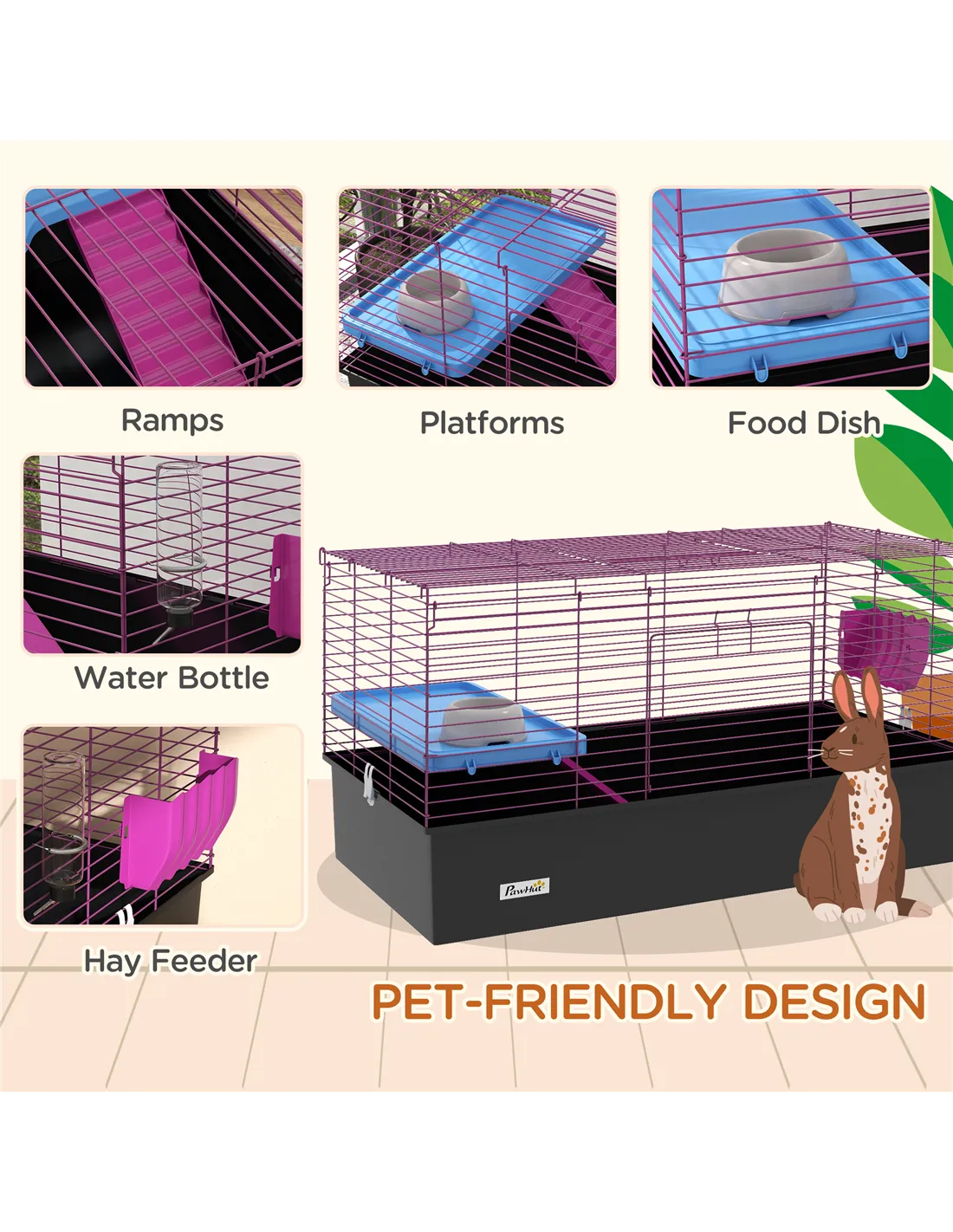 - Features a platform with a ramp, a hay feeder, a water bottle and a food dish