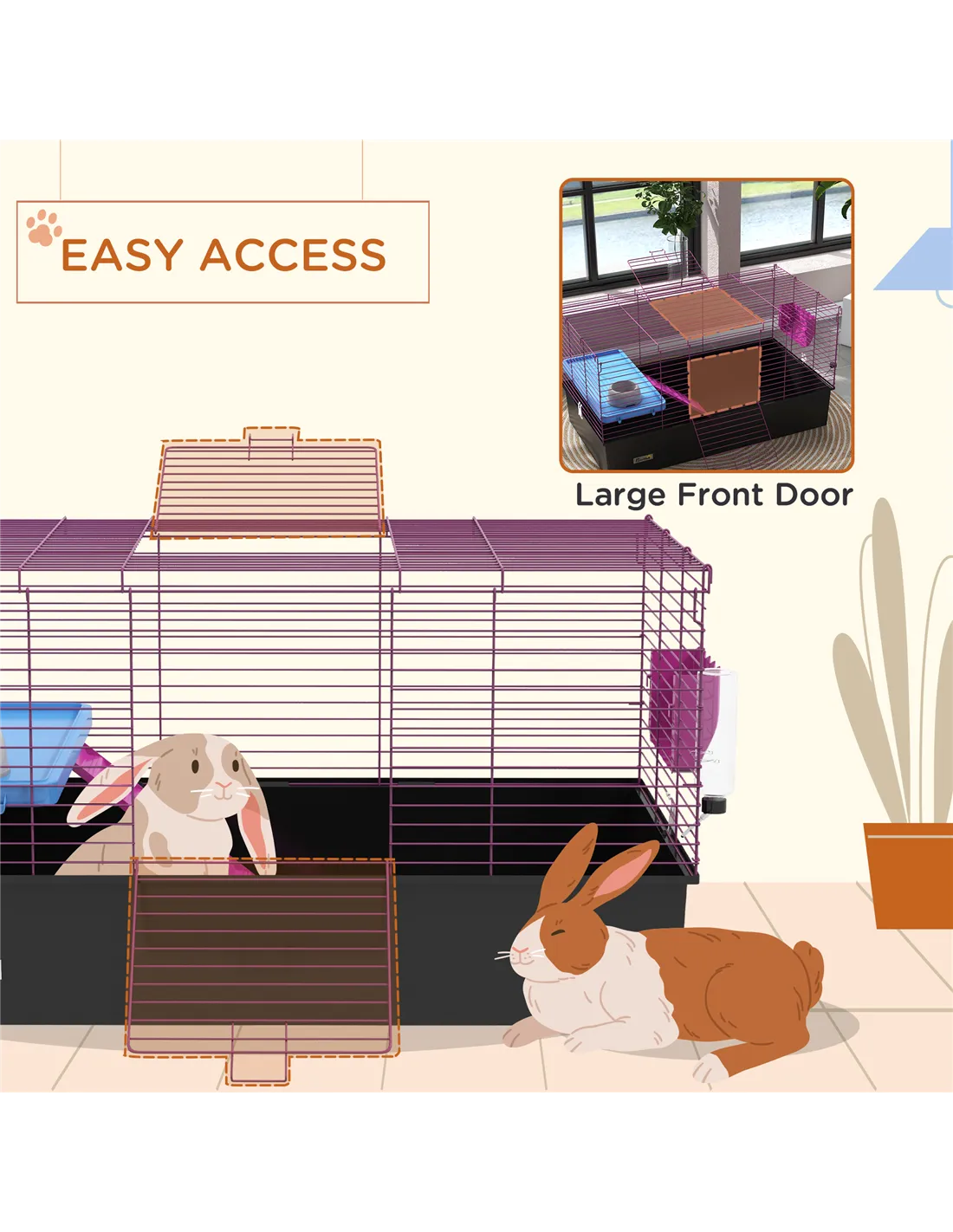 The PawHut small animal cage is an ideal habitat for a variety of pets including chinchillas, small rabbits, guinea pigs, and other similar-sized creatures. Its spacious design with a platform and ramp encourages natural climbing and exploration, making it perfect for active pets. Place the cage in a quiet corner of your living room or a dedicated pet area to create a cosy and secure environment. The deep base simplifies litter management, helping maintain a hygienic space. Thanks to the large front door, daily feeding, cleaning, and interaction with your pets become effortless. This versatile enclosure also works well as a pet playhouse, providing both shelter and stimulation for your furry friends.
