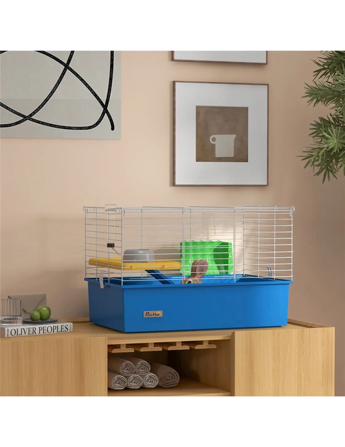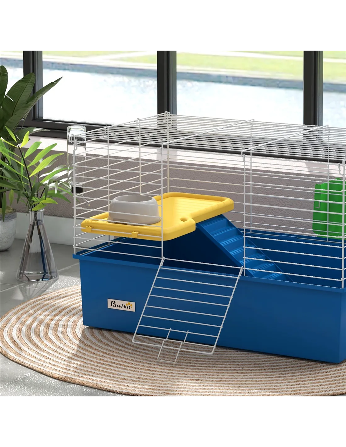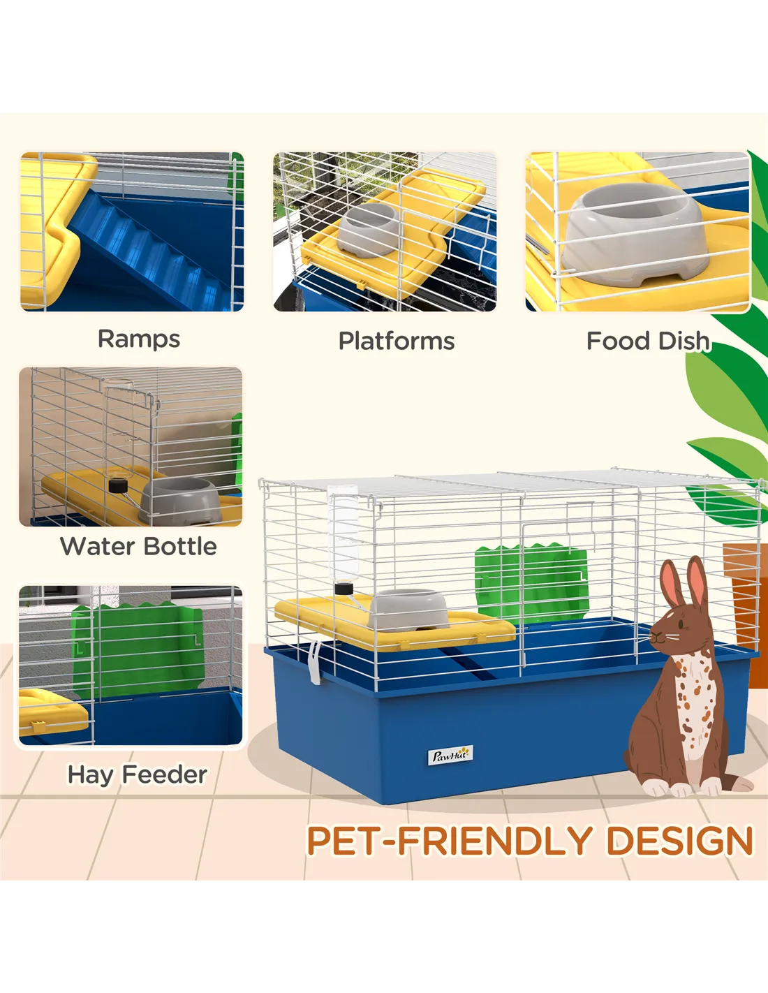 Watch pets thrive in this PawHut cage – a wonderful home for small animals. A colourful safe haven, it's made with a cosy living area, protected by metal wire caging, keeping them safely inside and allowing air to flow through. Inside features a small platform with a food bowl, a water bottle, a ramp and a hay feeder, providing everything they need. Plus, there's a deep base, which collects dirt and debris, keeping their space clean and comfortable. Give your pets the home they truly deserve.