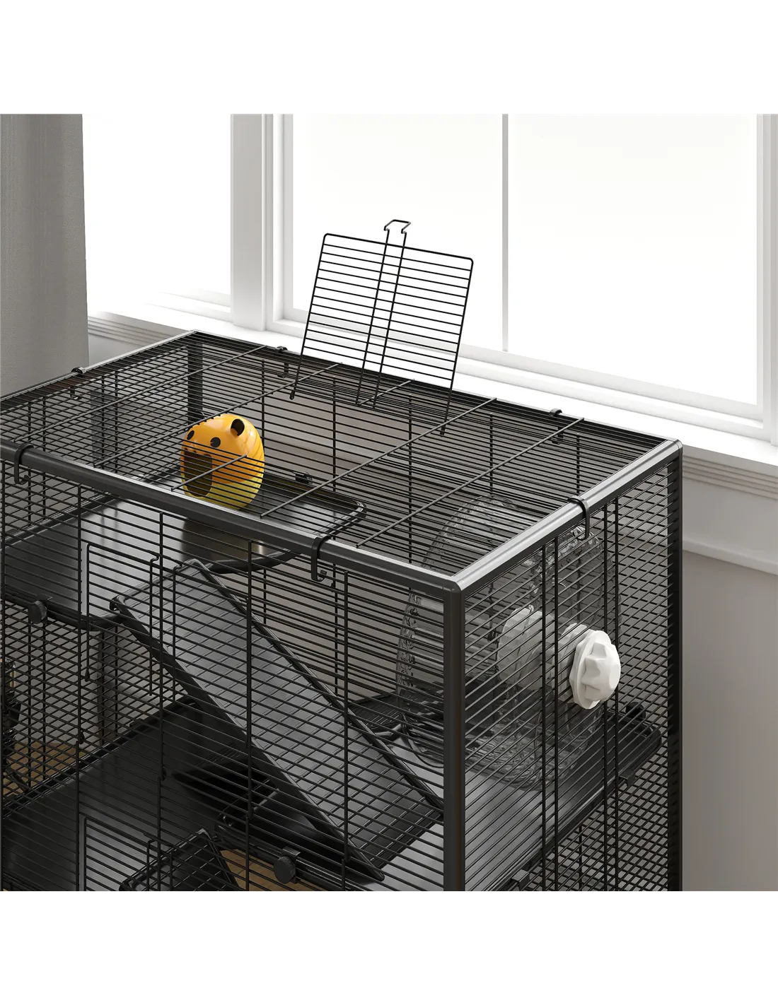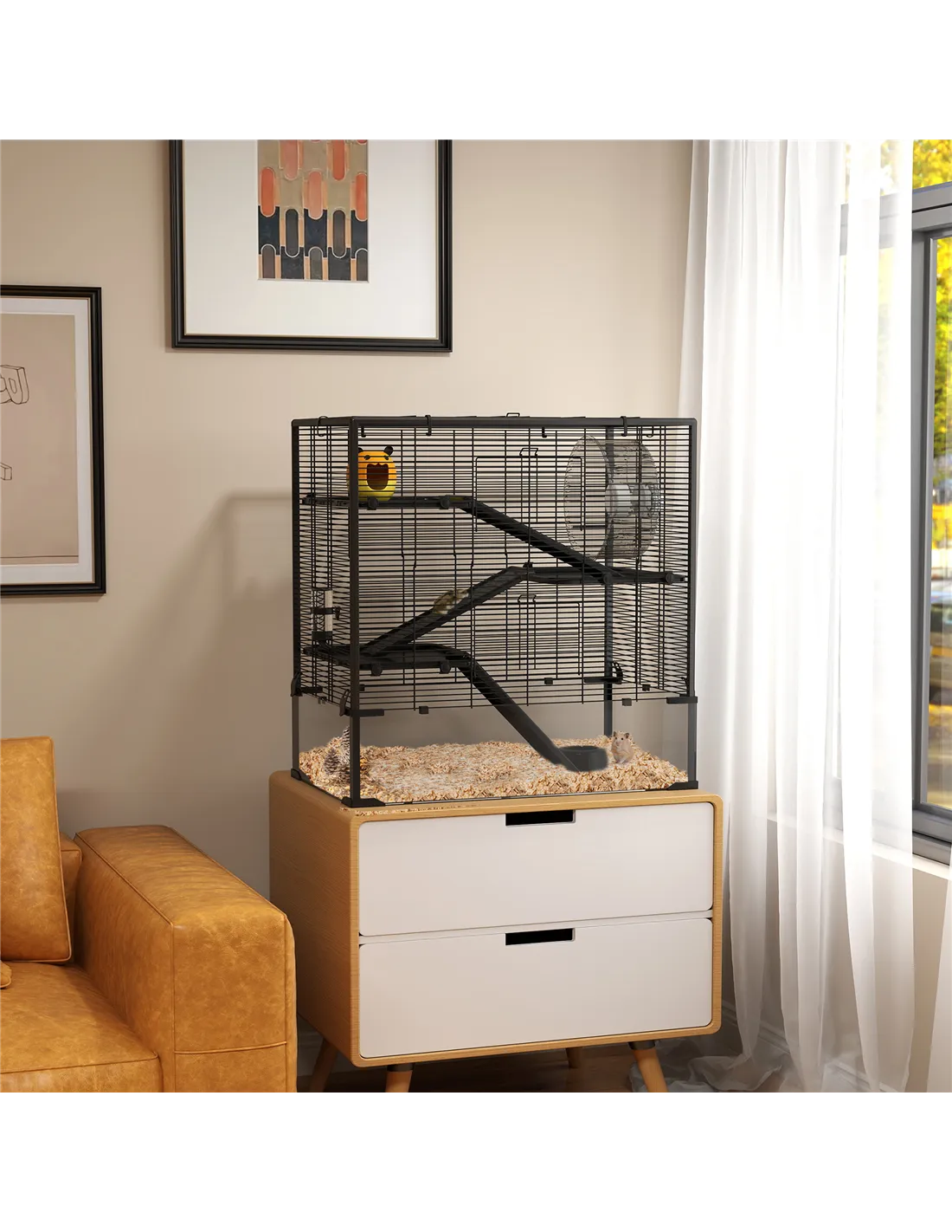 Create hamster heaven with the spacious PawHut hamster cage. This four-tier design includes platforms, ramps, a cosy hut, a large running wheel, a food bowl and a water bottle, so your pet can roam, play, relax, eat, drink and exercise. With a tempered glass bottom and a 23cm height, you can add paper or wood chips to create a cosy, natural habitat for digging and burrowing. Suitable for Syrian hamsters, rats and gerbils, it offers a playful and secure haven for your pets to flourish.