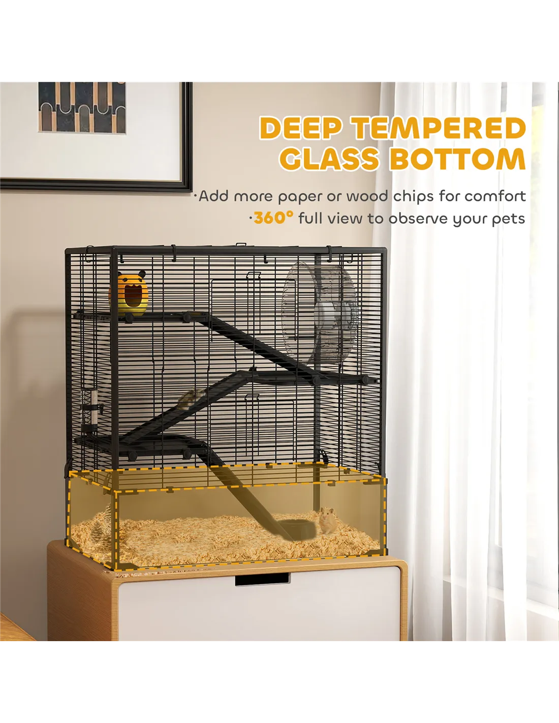 - Tempered glass bottom for adding paper or wood chips, creating a cosy habitat