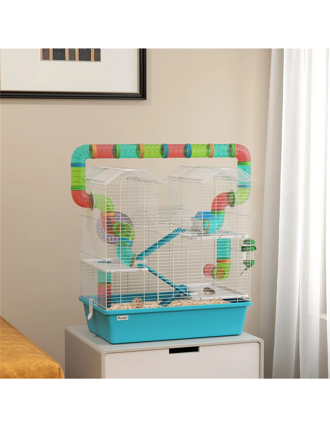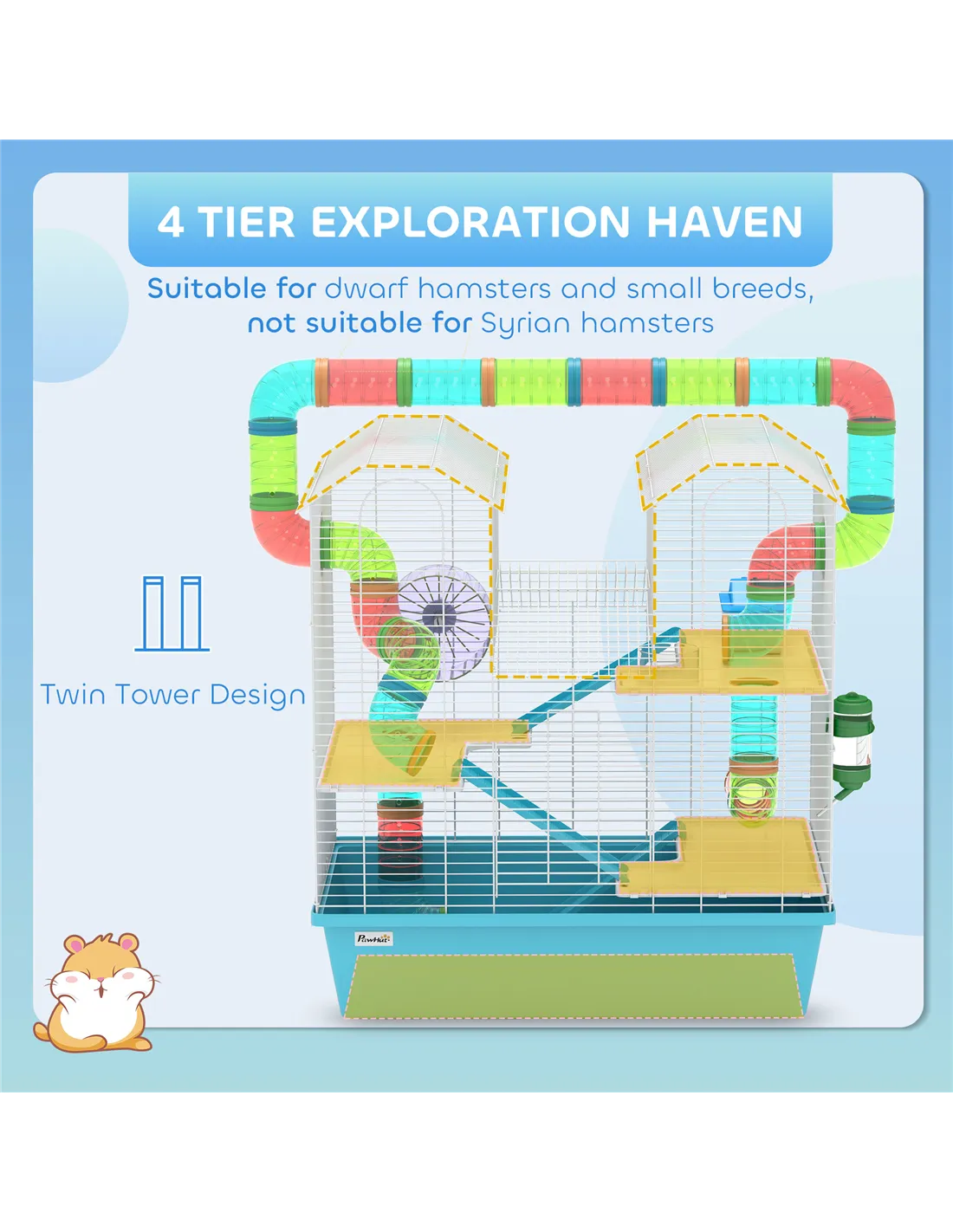 The PawHut 4 Tier Hamster Cage is an ideal habitat for dwarf hamsters and miniature gerbils, offering a stimulating environment that encourages natural behaviours. Its multi-level design with colourful tubes and ramps provides ample space for climbing, exploring, and exercising, helping to keep your small pet active and healthy. The cosy hut offers a quiet retreat for rest, while the included exercise wheel supports daily physical activity. This cage fits perfectly in living rooms, bedrooms, or dedicated pet areas, blending functionality with a charming light blue and white aesthetic. Thanks to configurable accessories, you can personalise the layout to suit your pet’s preferences, creating a comfortable and engaging home.