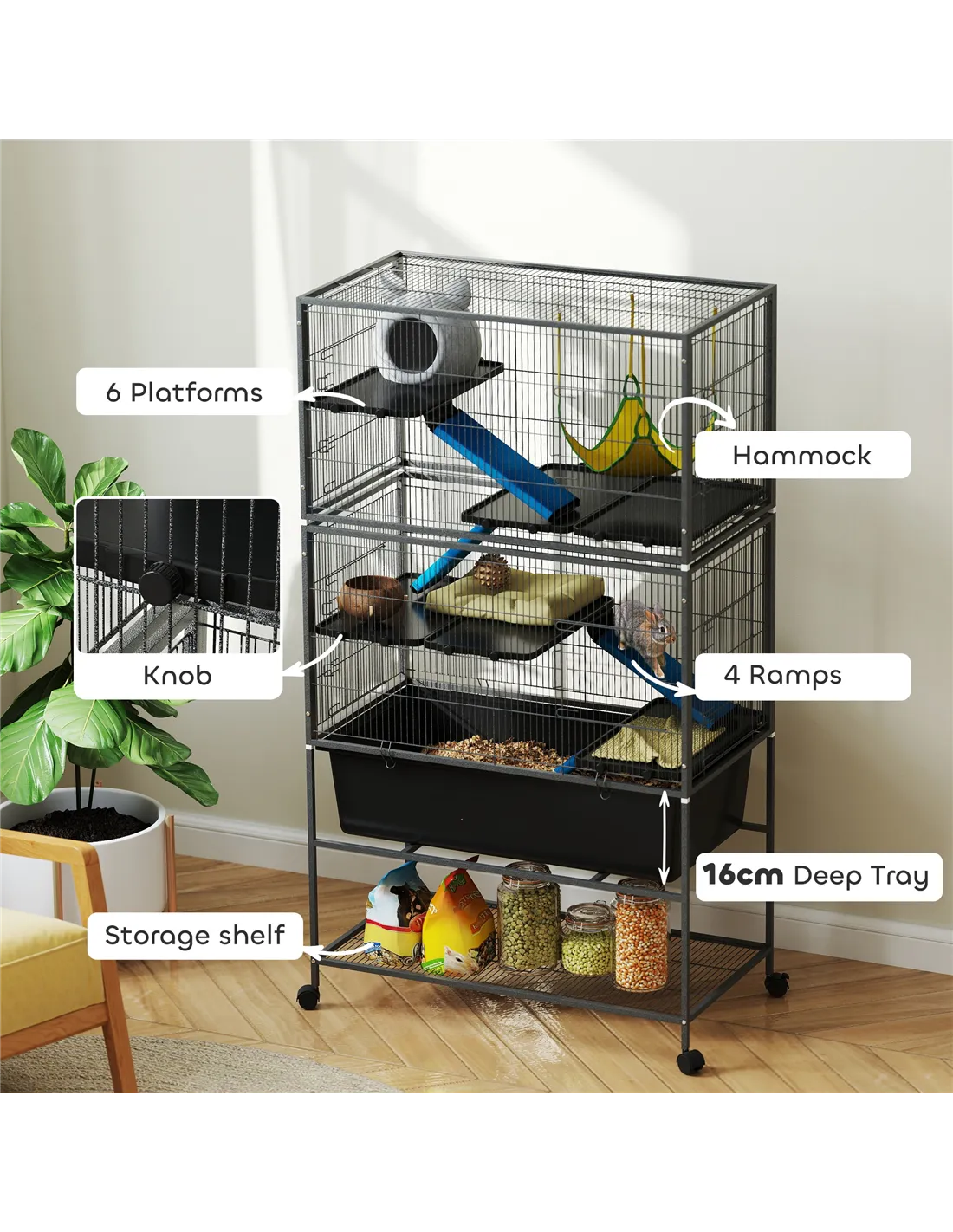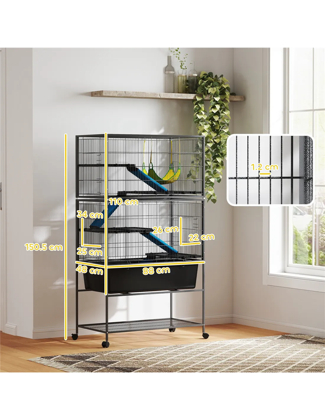PawHut 5 Levels Rolling Small Animal Cage with Non Slip Ramps, Slide Out 16cm Deep Tray, 88 x 48 x 150.5cm, Dark Grey