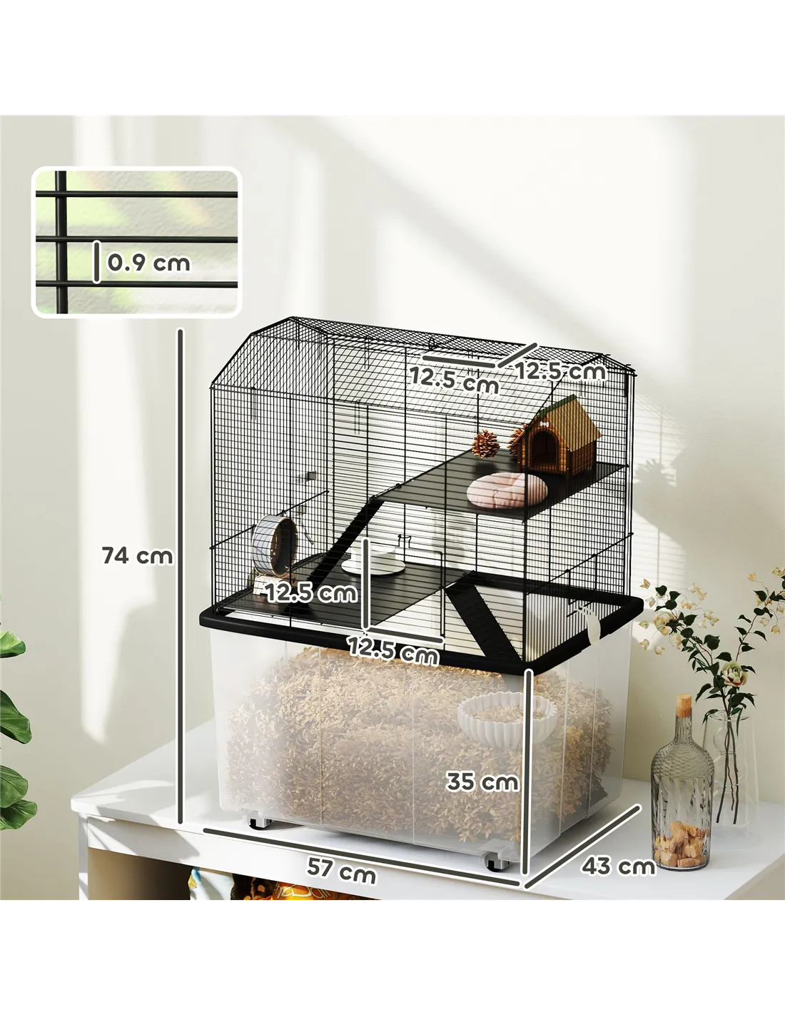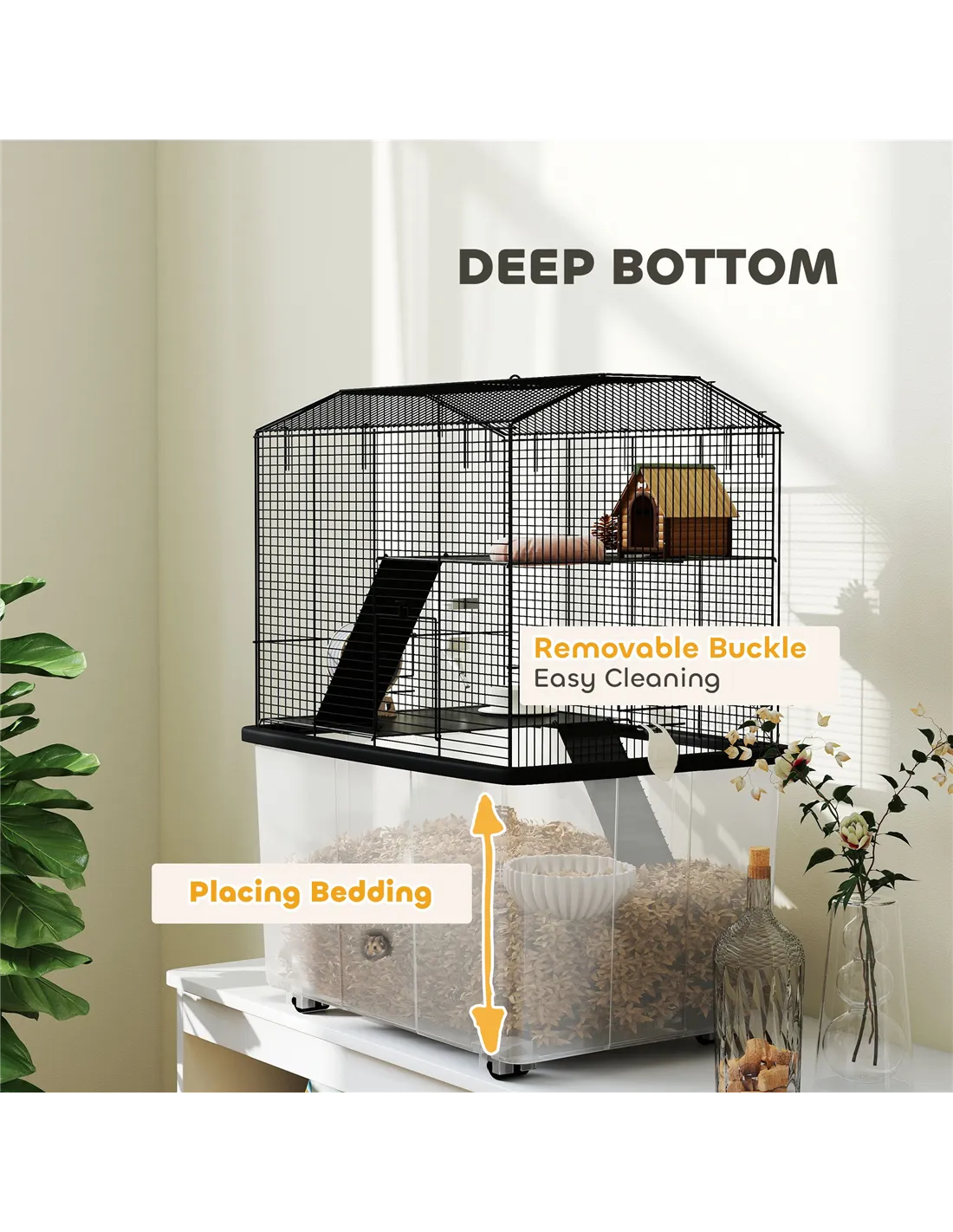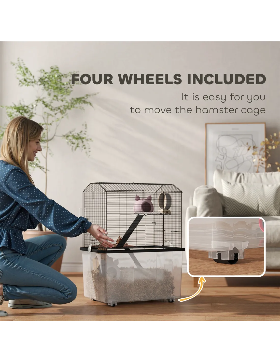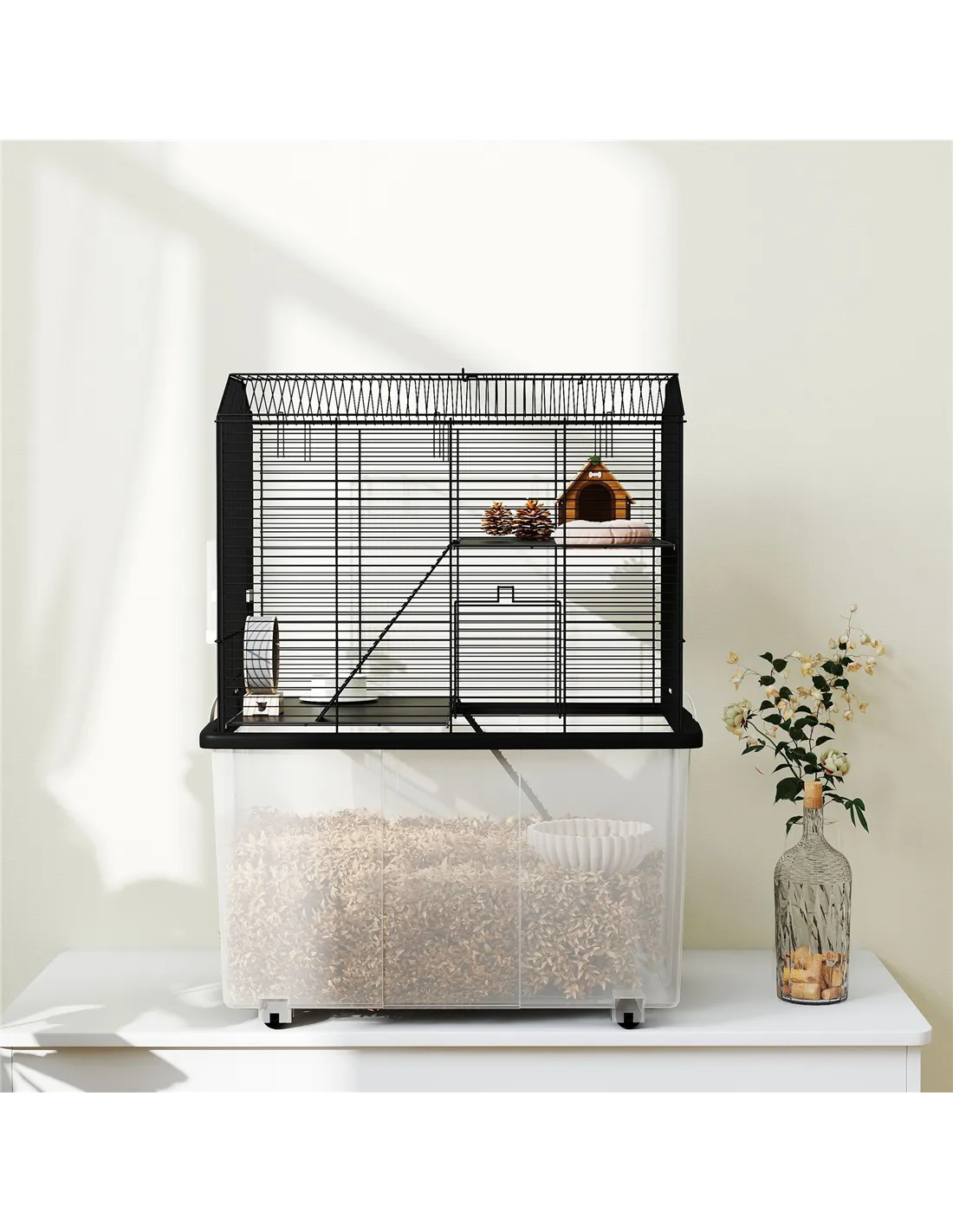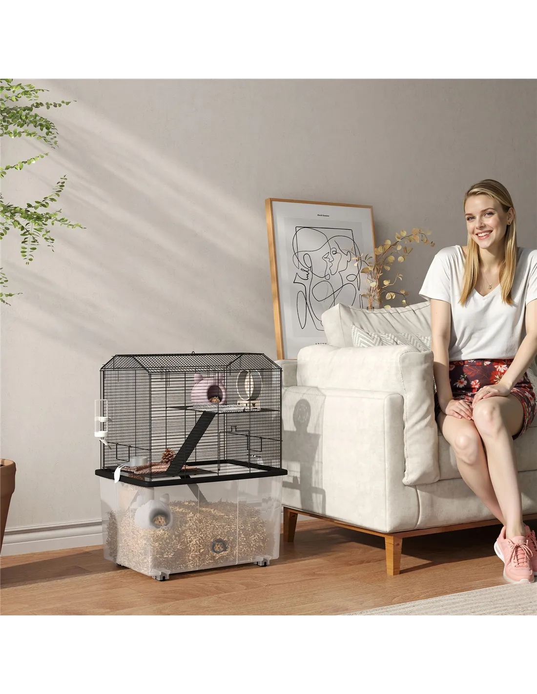 - Perfect for placing in living rooms or bedrooms, thanks to its compact footprint and built-in wheels, allowing easy relocation for cleaning or rearranging your pet’s habitat.