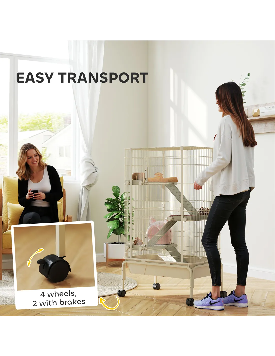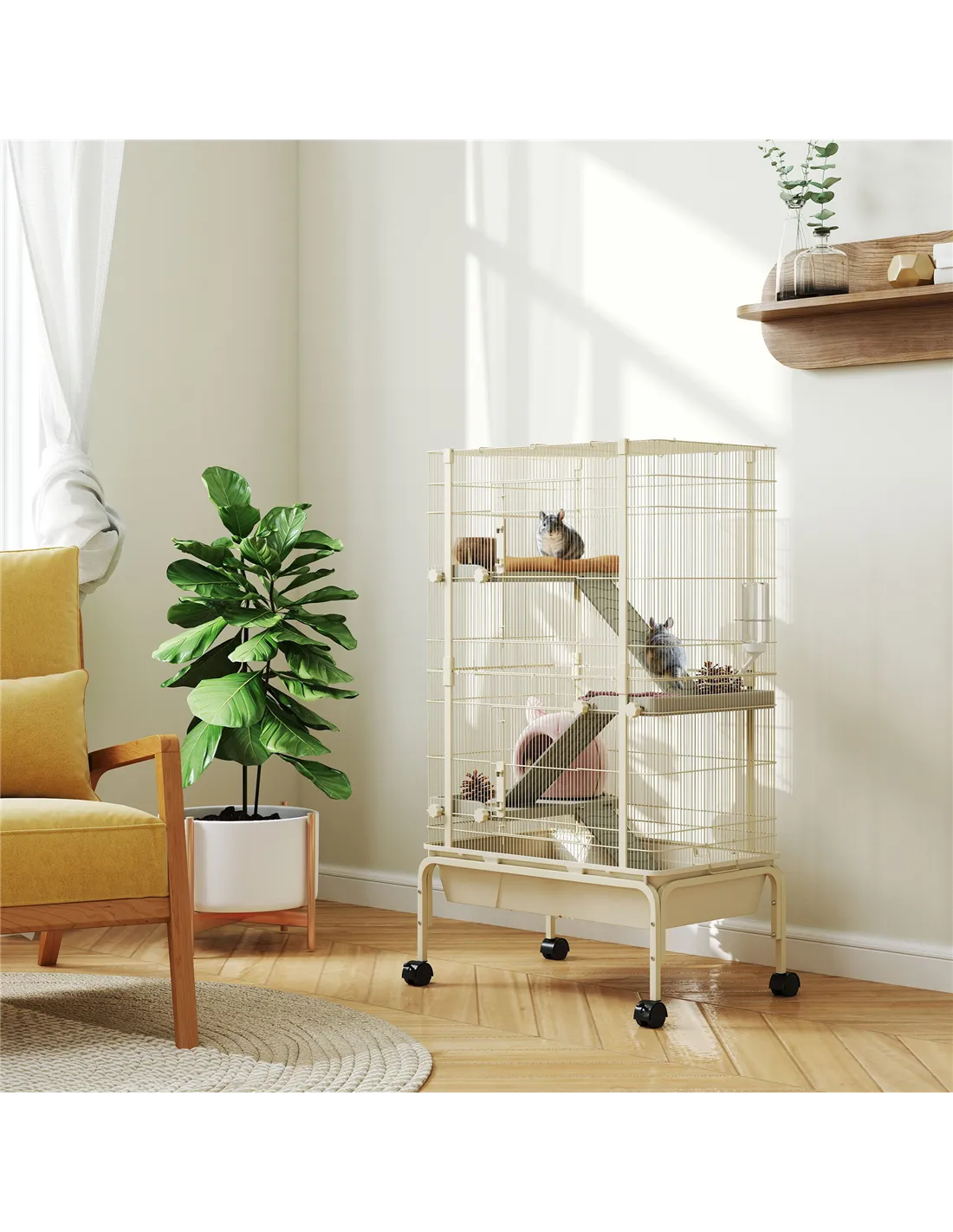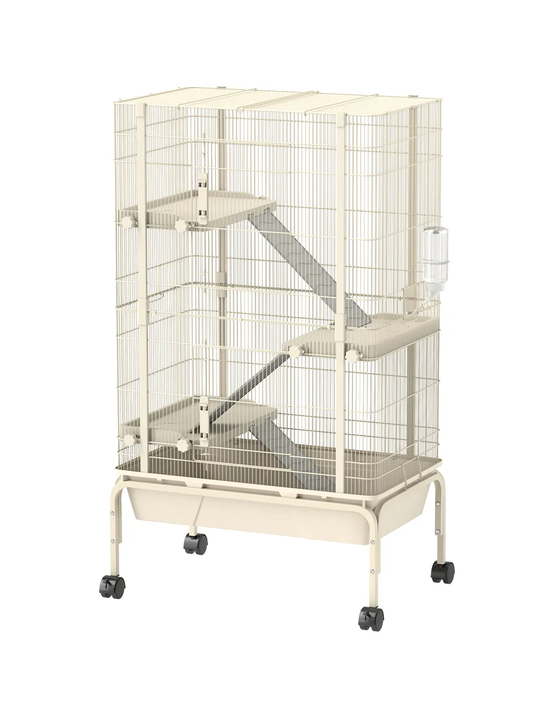 PawHut 4-Level Rolling Small Animal Cage, Rabbit Cage with 3 Ramps, Water Bottle, Food Dish, 15cm Deep Tray, Beige