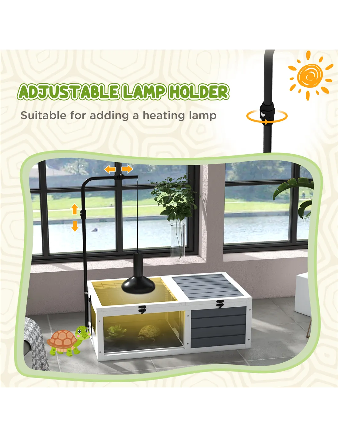 - With an adjustable lamp holder, you can add a heating lamp to get the right temperature