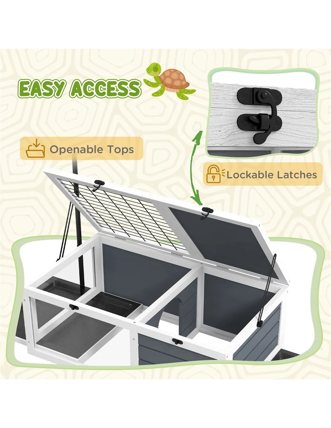 The PawHut tortoise table is an ideal addition to any reptile enthusiast’s home, providing a secure and comfortable environment for tortoises to explore and bask. Its two-room design, featuring a spacious main house and an extended run area, allows your pet to enjoy natural behaviours such as roaming and sunbathing under a heat lamp. The adjustable lamp holder ensures you can maintain optimal warmth, essential for your tortoise’s health. Thanks to the openable lids and pull-out trays, this habitat fits perfectly in living rooms, conservatories, or dedicated pet spaces, making daily care and cleaning straightforward. Its neutral grey and white finish complements modern interiors, blending seamlessly while offering your pet a safe retreat.