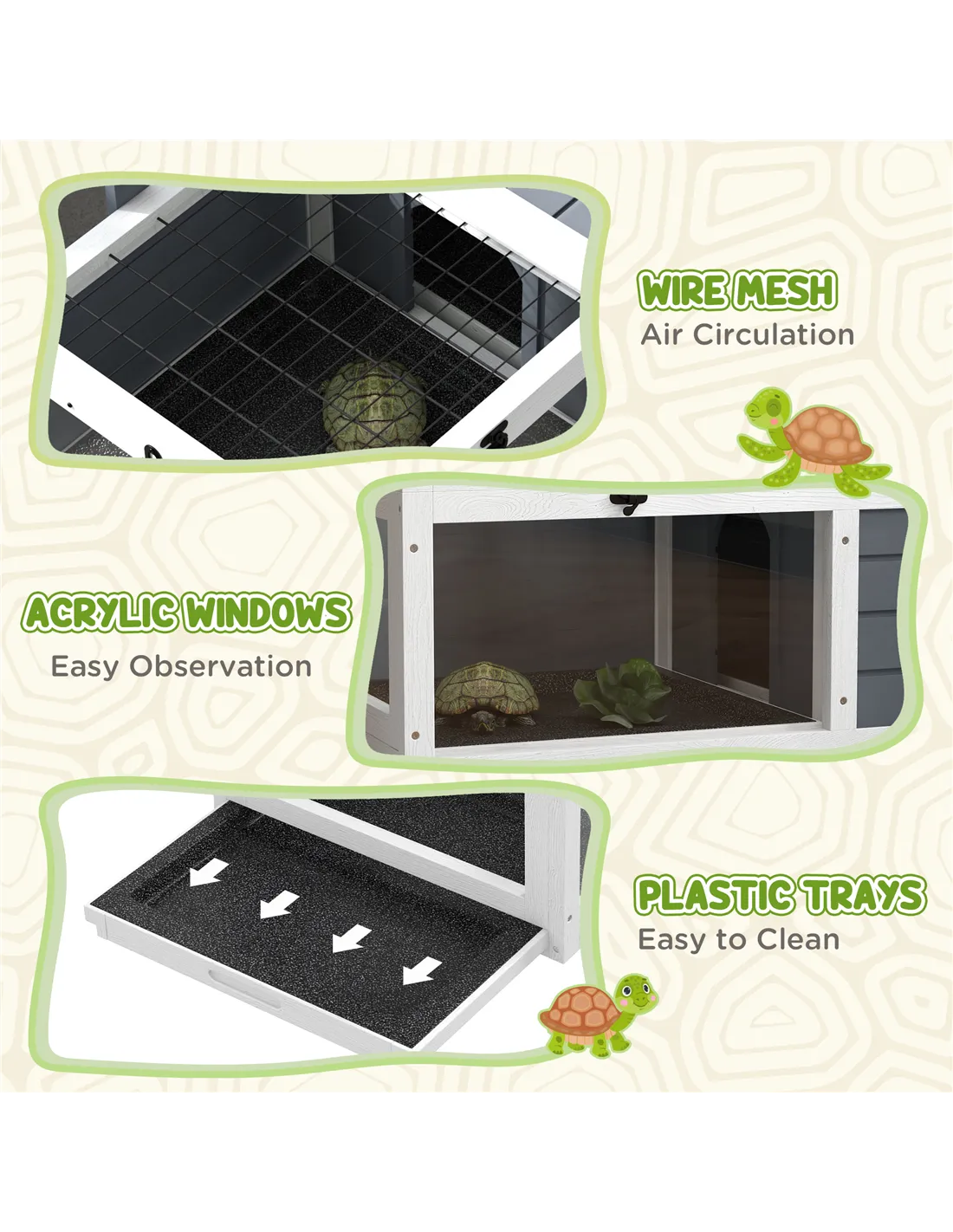 Introducing the PawHut two-room tortoise house – a wonderful habitat for reptiles. With a roomy living space and an expansive run area, it's great for roaming and basking. Achieve the right temperature with the adjustable lamp holder. Cleaning is a breeze, thanks to the double pull-out tray and openable lids, simplifying pet care. Elevate your pet's lifestyle with this delightful home, designed to foster their well-being, allowing them to thrive.