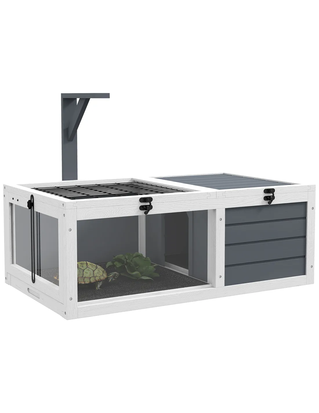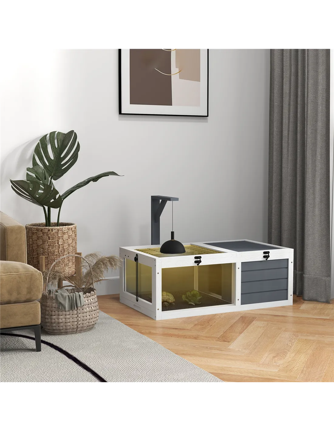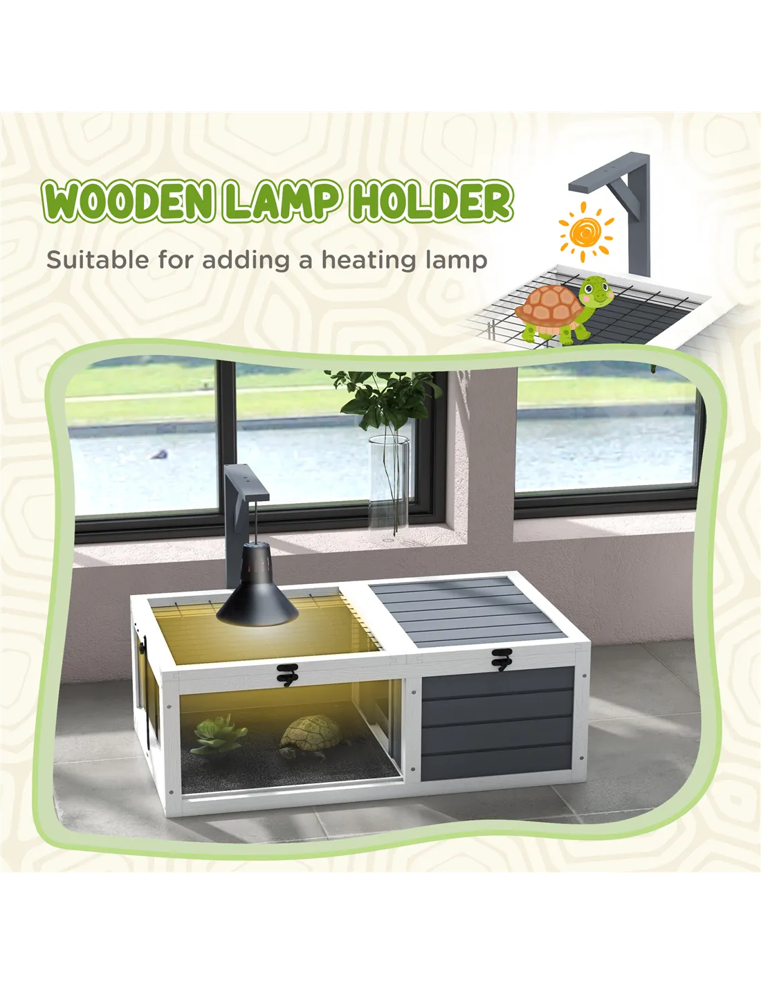Introducing the PawHut two-room tortoise house – a wonderful habitat for reptiles. With a roomy living space and an expansive run area, it's great for roaming and basking. Achieve the right temperature with the wooden lamp holder. Cleaning is a breeze, thanks to the double pull-out tray and openable lids, simplifying pet care. Elevate your pet's lifestyle with this delightful home, designed to foster their well-being, allowing them to thrive.