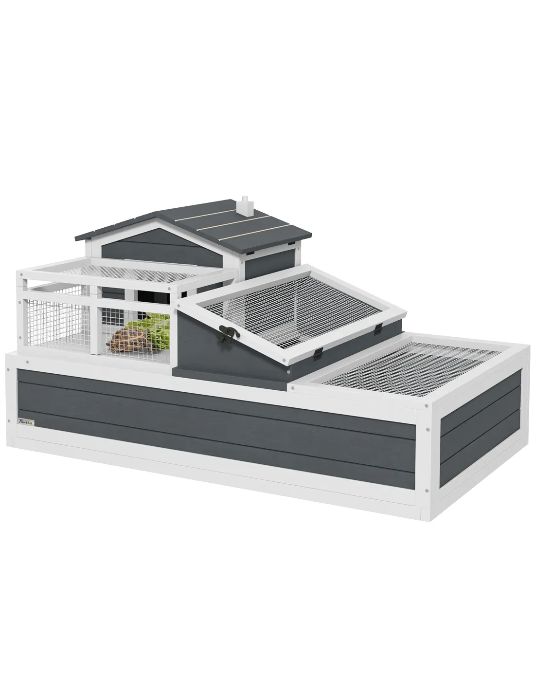 PawHut Tortoise House 3-Room with 2 Stories, Ladder, Balcony, Tray, Openable Roof, 59H x 112L x 65Wcm, Grey
