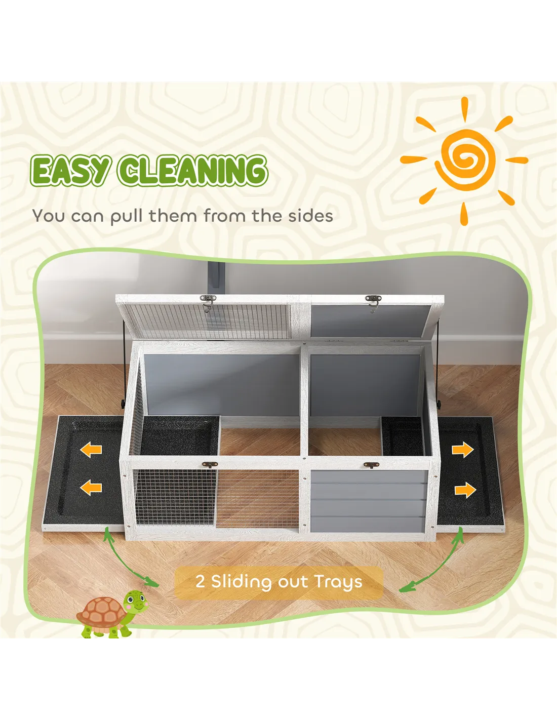 A wonderful home for turtles, this PawHut tortoise house offers a cosy hideaway for peaceful retreats and a basking area essential for cold-blooded reptiles. With a built-in lamp holder, you can easily add a lamp to achieve the right temperature for your pets to thrive. Two slide-out trays make cleaning simple, ensuring a clean and hygienic living space.