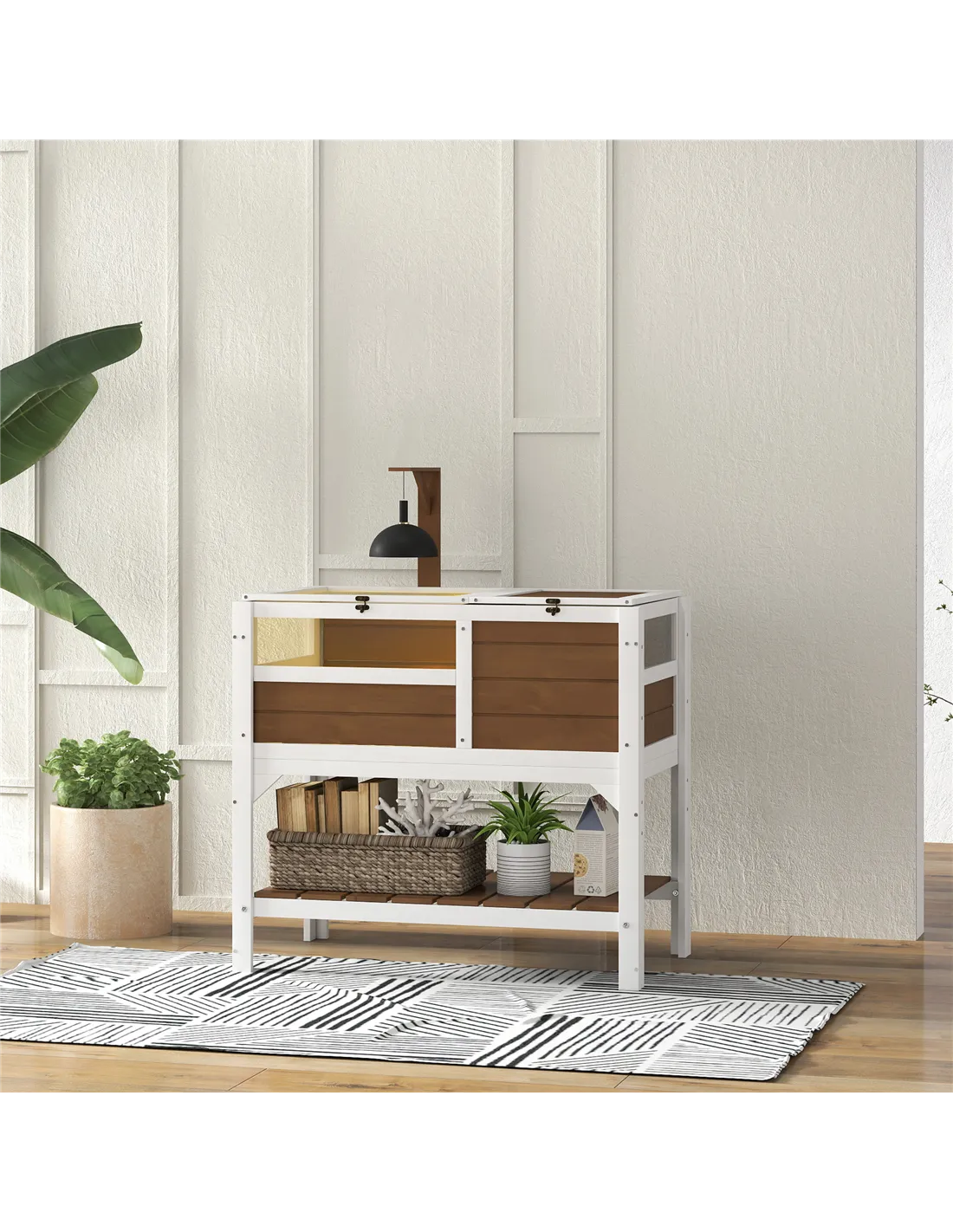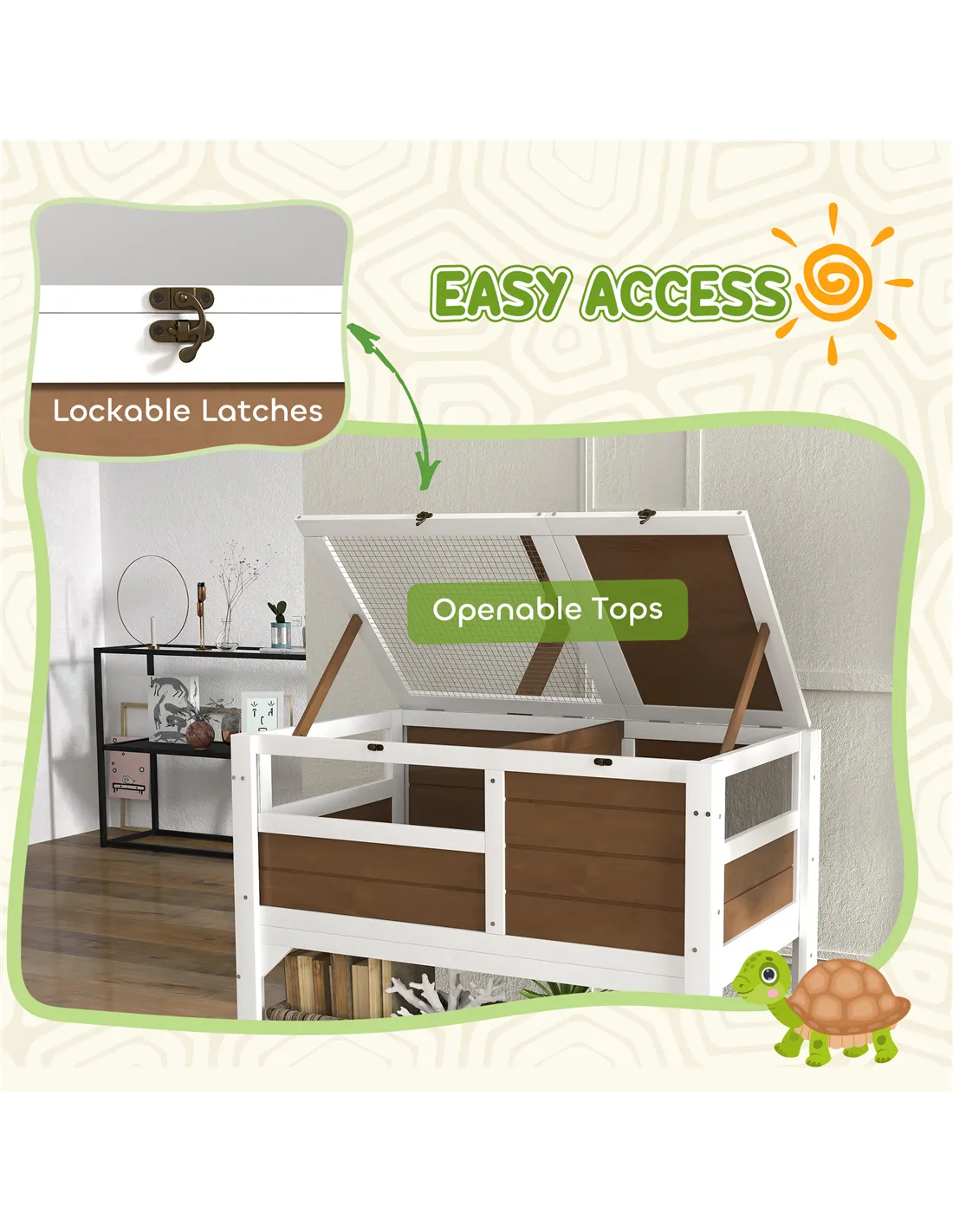 Place the house in a sheltered garden corner or on a patio where it can benefit from natural light but remains protected from harsh weather. The bottom shelf is convenient for storing feeding bowls, supplements, or cleaning tools, keeping everything organised and within reach. Thanks to the two lockable lids and removable plastic tray, maintenance is straightforward, making this a practical choice for both new and experienced reptile owners.