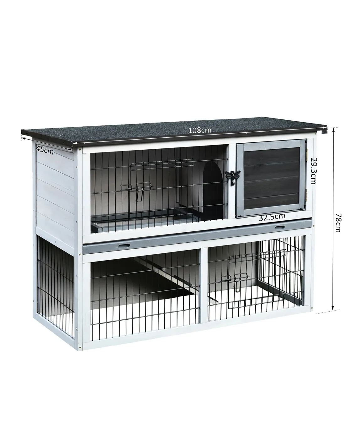 The PawHut two-level wooden hutch is perfect for providing a comfortable and secure home for your small pets such as rabbits, guinea pigs, and hamsters. Its spacious design allows pets to enjoy both indoor shelter and an outdoor run, making it ideal for indoor or garden use. Place the hutch in a shaded area of your garden or on a balcony to give your pets fresh air while keeping them protected from the elements. The slide-out tray simplifies cleaning, ensuring a hygienic environment with minimal effort. Thanks to the non-slip ramp and multiple access points, it’s easy to interact with your pets and maintain their living space. This versatile cage suits both new and experienced small animal owners looking for a durable and practical habitat.