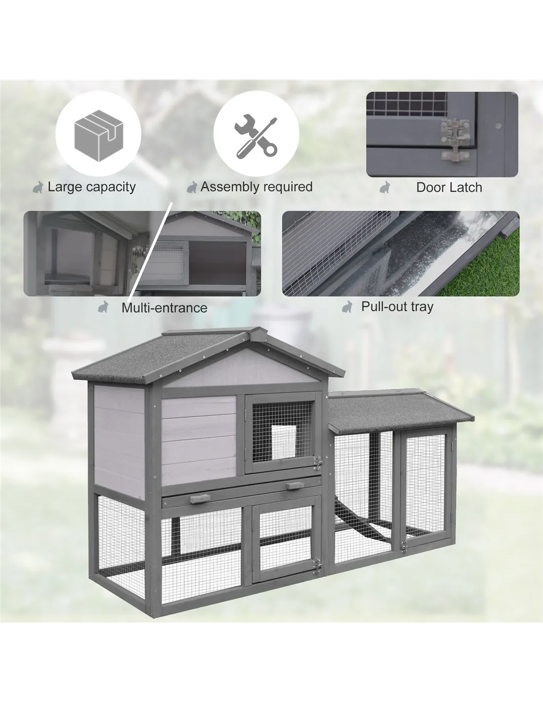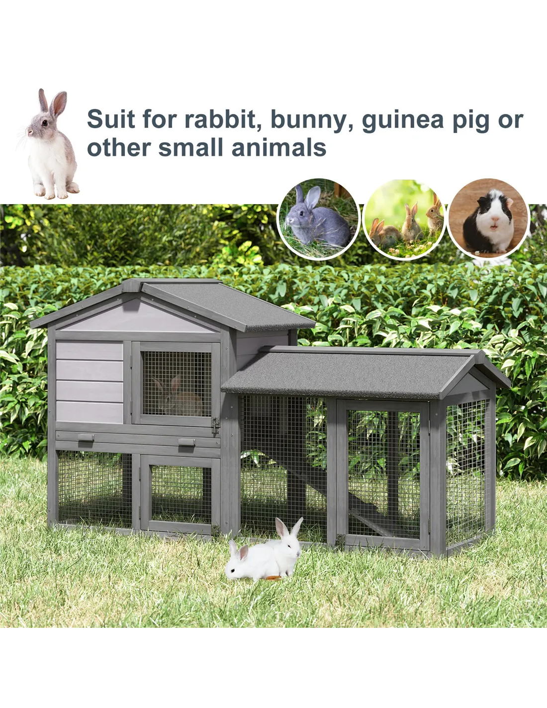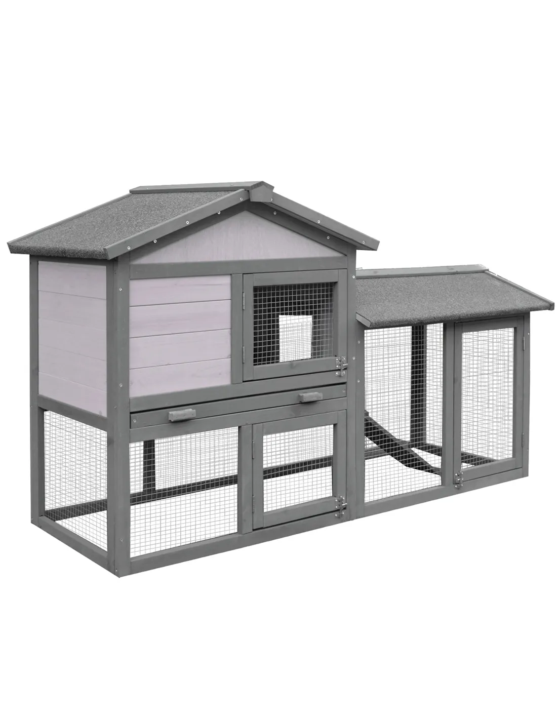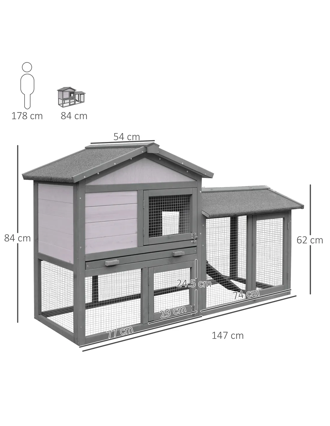 The PawHut two-level wooden hutch is ideal for providing a safe and comfortable outdoor space for your guinea pigs, rabbits, hamsters, or other small pets. Its dual-level design offers ample room for exercise and rest, while the attached run allows your pets to enjoy fresh air under supervision. Place the hutch on a flat surface or add a bottom tray for extra protection, especially if housing rabbits. Thanks to the removable roof and easy-access door, feeding and cleaning are hassle-free. This versatile hutch fits perfectly in gardens, patios, or balconies, creating a natural habitat that encourages your pets’ wellbeing and activity.