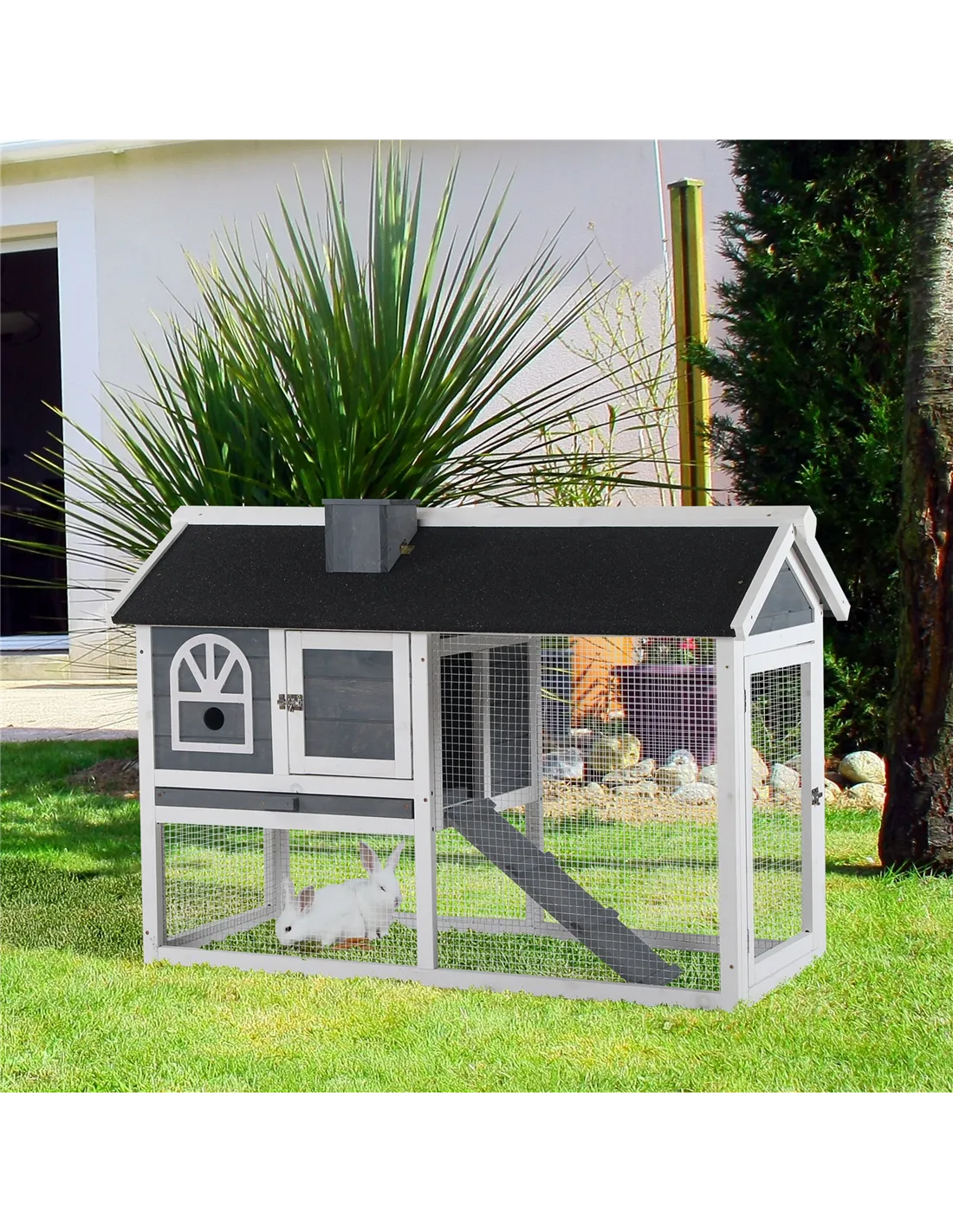 This outdoor rabbit cage from PawHut is perfect for use with rabbits, guinea pigs and similar sized animals. It gives a mix of living space - the upper house offers them a private area, whilst the lower area gives them open space for free movement. Lockable doors and the slide-out tray provide easy access for cleaning, feeding and other tasks. Finished with an asphalt roof to keep inside dry from light-medium rain.