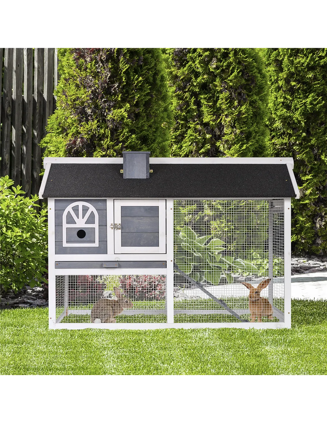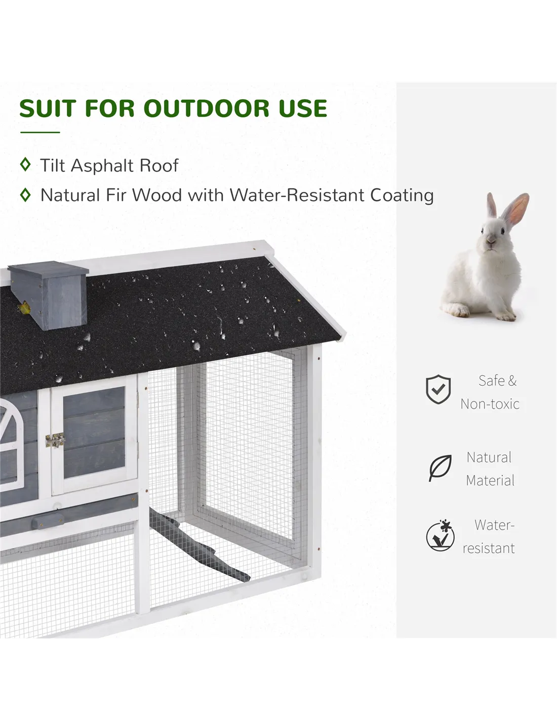 The hutch is designed for light outdoor use and can withstand light to moderate rain thanks to its asphalt roof and water-resistant coating. However, it is not recommended to leave it exposed during heavy weather or harsh winter conditions. - How many pets can comfortably live in this hutch?