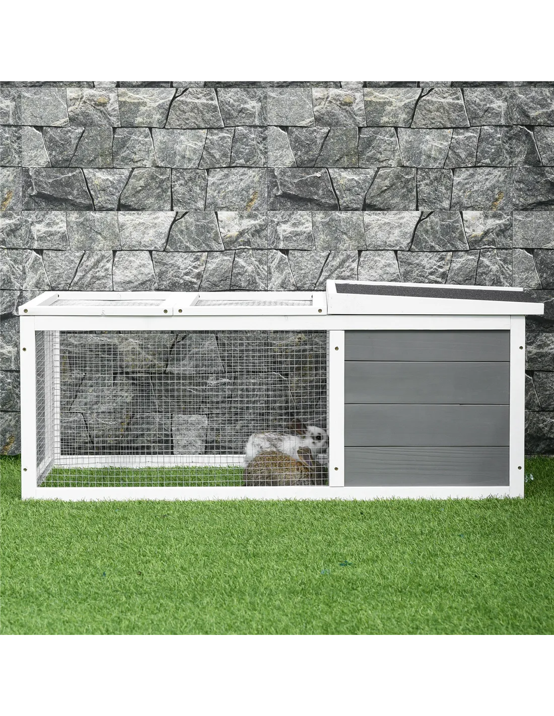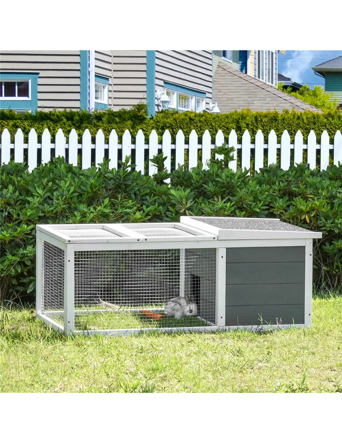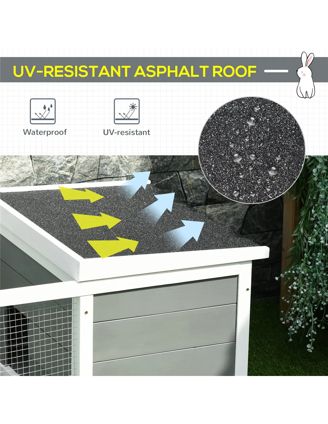 Absolutely. The sturdy wooden frame combined with a UV-resistant, water-repellent asphalt roof protects pets from sun, rain, wind, and snow, making it suitable for year-round outdoor use. - How many guinea pigs or rabbits can this hutch accommodate?