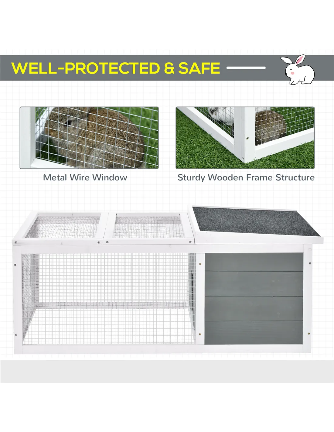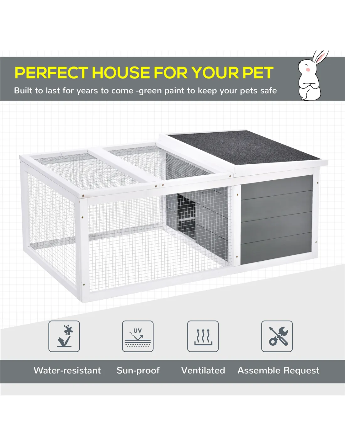 Does your little lovely pet need a safe and protected play space? Our pet house offers a great living/playing/exercising area for rabbit, bunny and other small animals. The sturdy wooden frame structure and asphalt roof can block sunlight and rain outdoors. It also makes it easy for you to watch your fluffy friends and bring a clear view for them. No worry about windy, rainy, snowy, it can be with you and your pets for years.