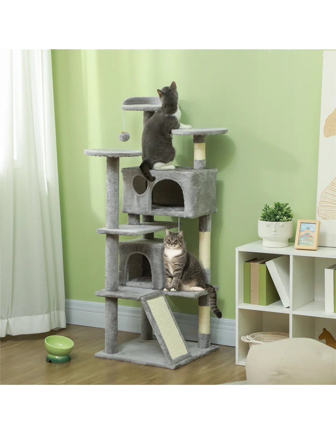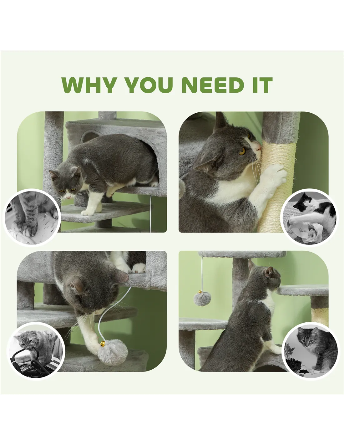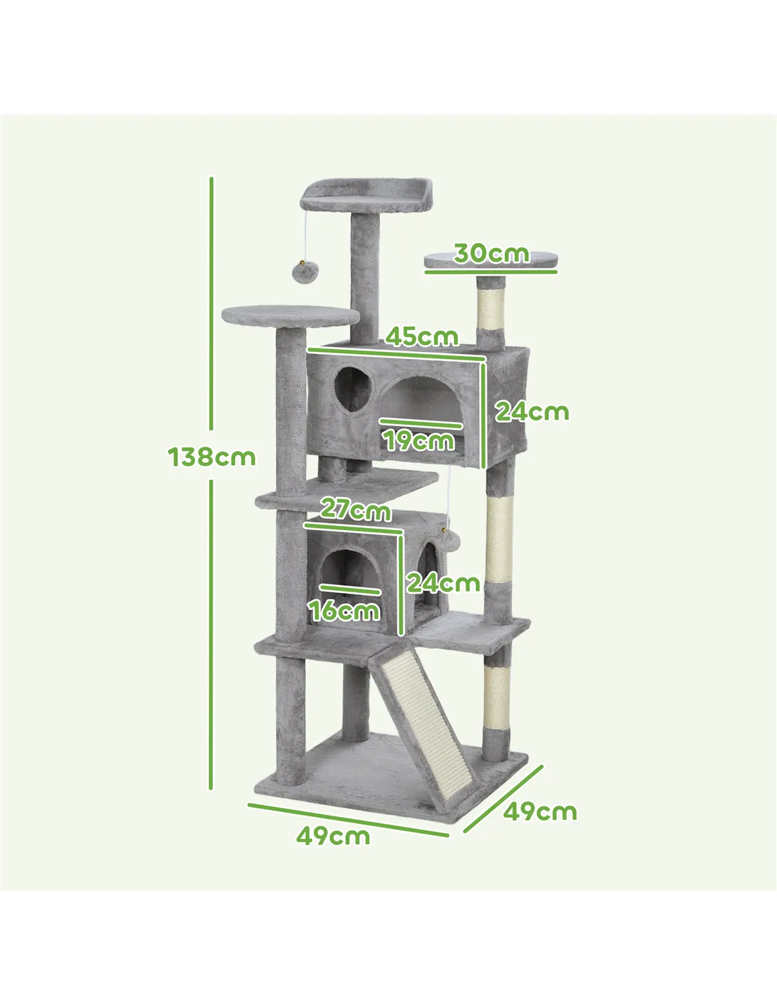 PawHut 138cm Cat Tree, Multi-Level Cat Tower with Scratching Posts and Pad, Bed, Condos, Platforms, Toy Balls, Light Grey