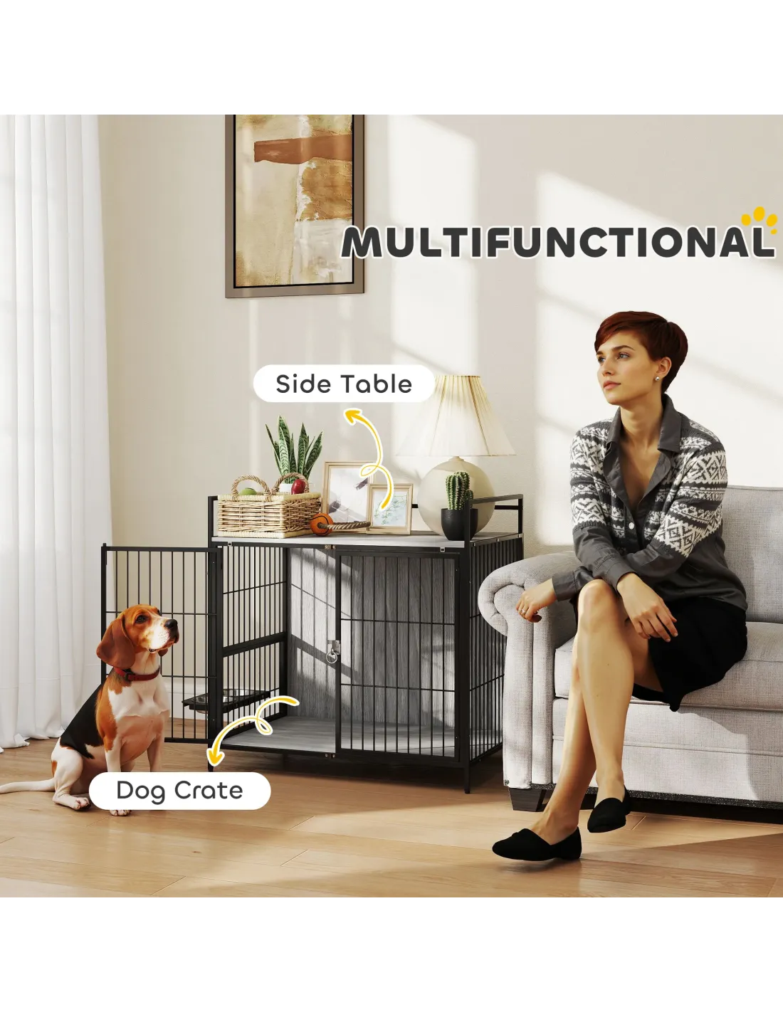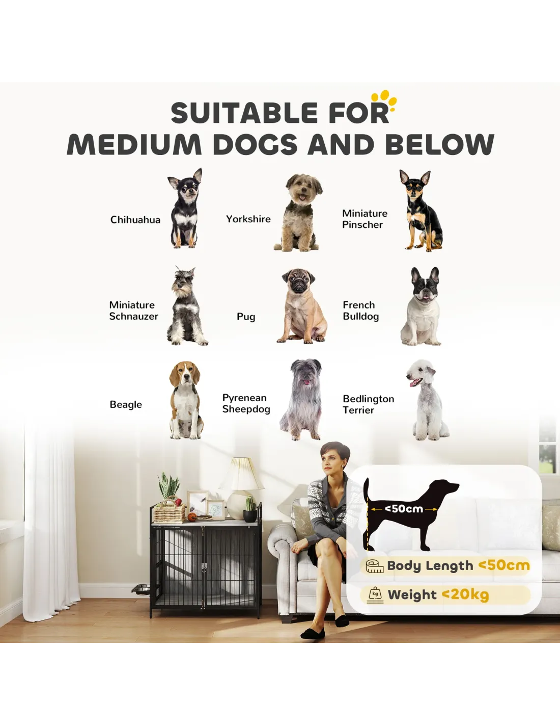 Upgrade your pet's space with the PawHut dog crate furniture that doubles as a sleek side table! Designed to blend seamlessly with your decor, it provides a secure and comfortable space for your furry friend while offering extra storage on top. The 360° rotating bowl holder with two bowls makes feeding effortless and the dual doors with a secure double-lock system ensure added safety. Robust, space-saving and stylish - great for pet owners who want both function and elegance in their home!