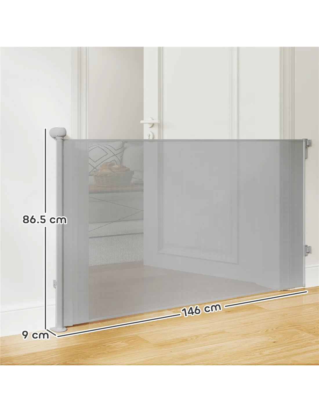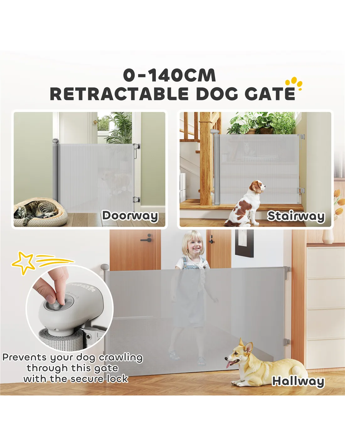 - Retractable dog gate adjusts to fit doorways up to 140 cm