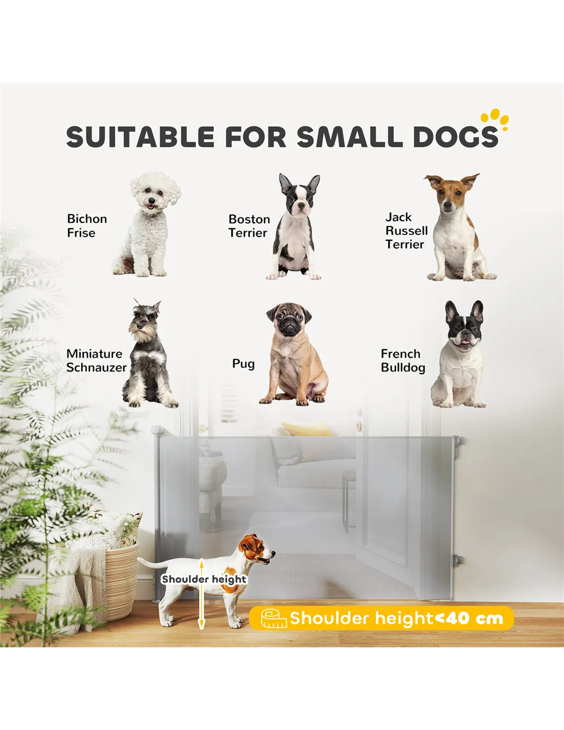 This gate is designed primarily for small dogs with a shoulder height under 40 cm. Larger breeds may require a more robust barrier. - How easy is it to install the gate?