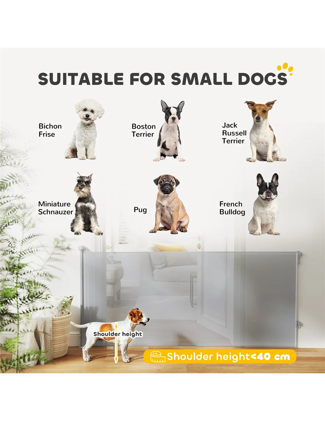 This gate is designed primarily for small dogs with a shoulder height under 40 cm and is best suited for trained pets. - Does the gate require professional installation?