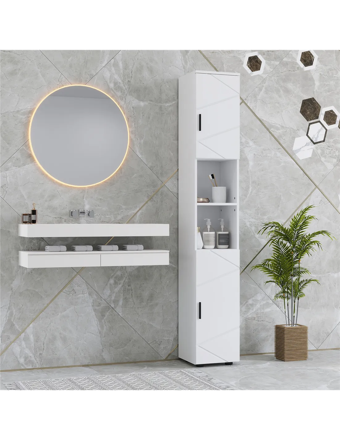 The kleankin Line Embossed Tall Bathroom Storage Cabinet - White is an excellent choice for maximising storage in compact bathrooms or en-suites. Its slim profile fits effortlessly into narrow corners, making it ideal for homes where space is at a premium. Use it to organise toiletries, towels, cleaning products, or even linen, keeping your bathroom clutter-free and stylish. The adjustable shelves allow you to customise the interior to suit your needs, whether storing tall bottles or folded towels. Thanks to its water-resistant coating and sturdy build, it is perfectly suited for humid environments, ensuring long-lasting durability. This cabinet also complements modern and minimalist interiors with its geometric embossed design, adding a subtle decorative touch to your bathroom.
