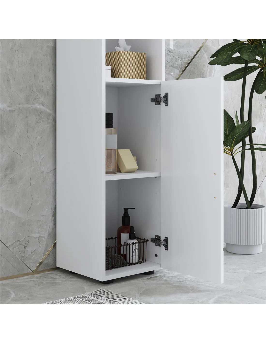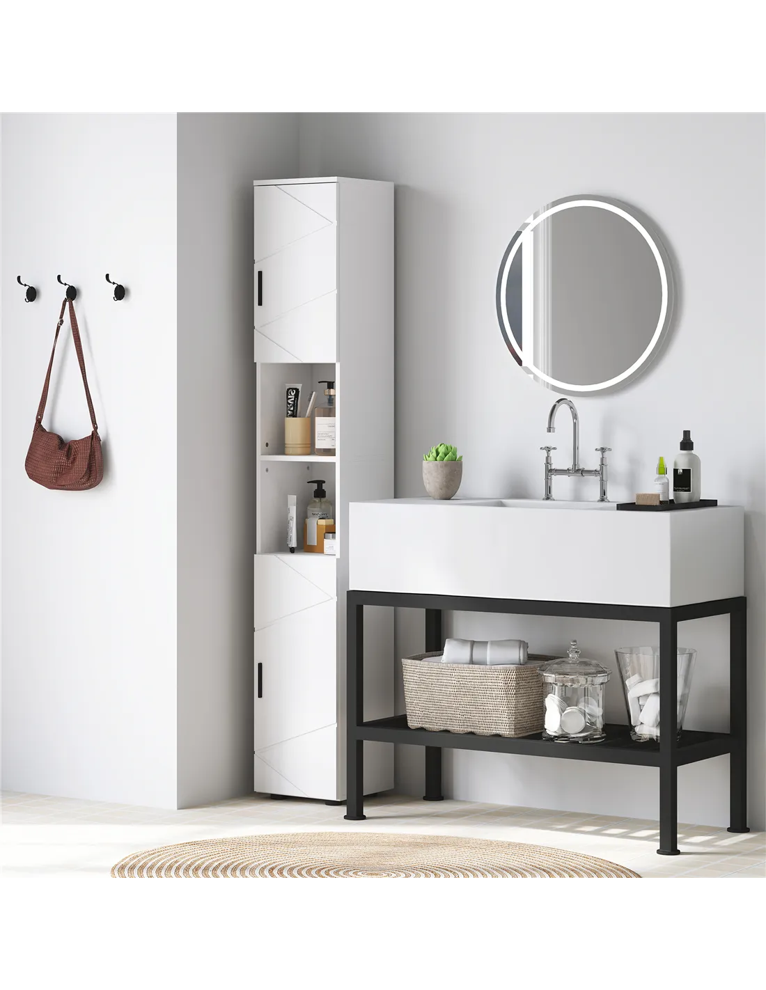 - Two open shelves and two 2-tier cupboards neatly arrange your towels, linen and other bathroom essentials