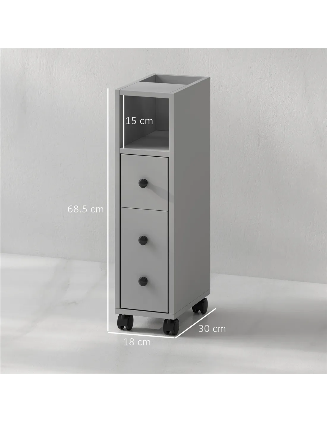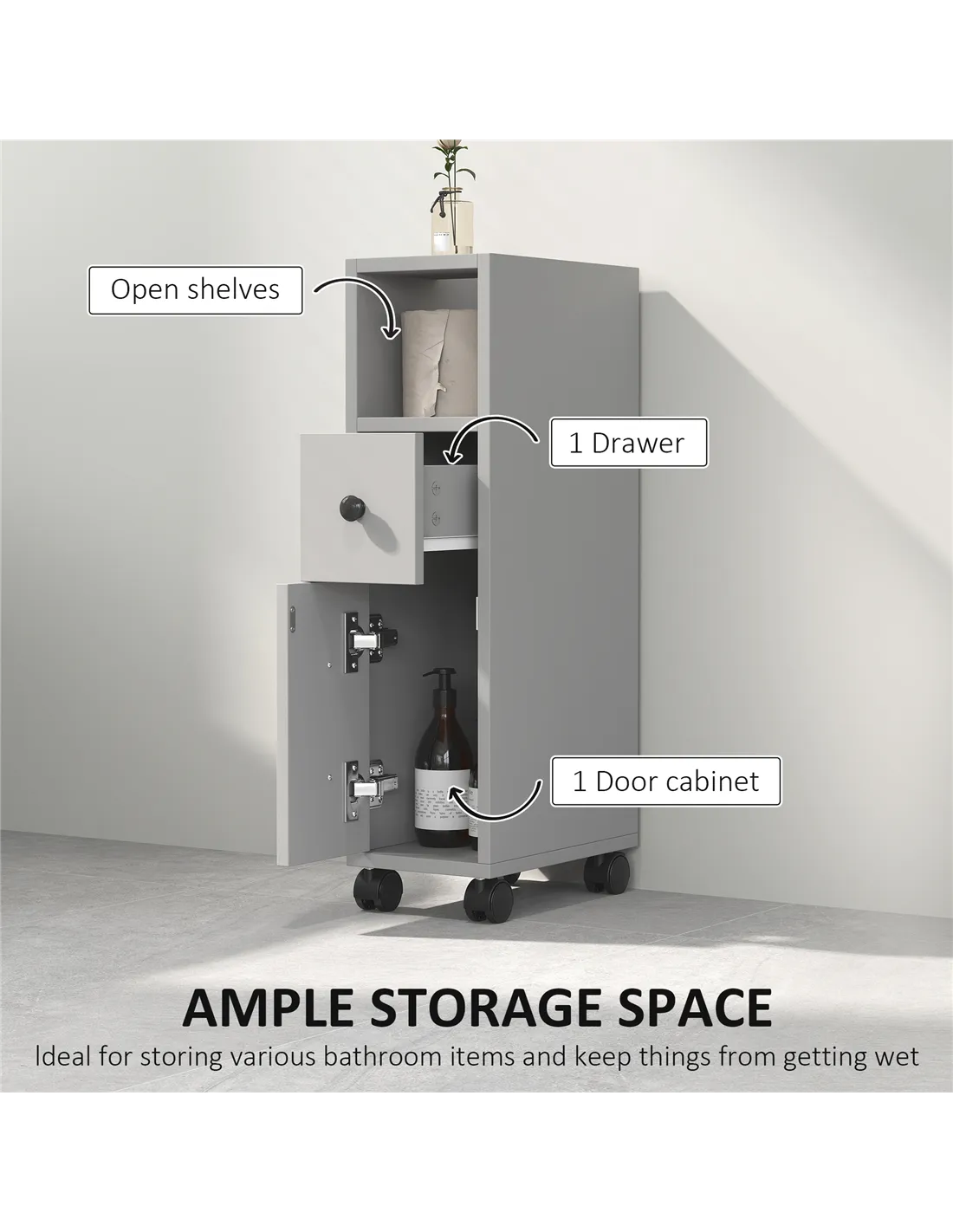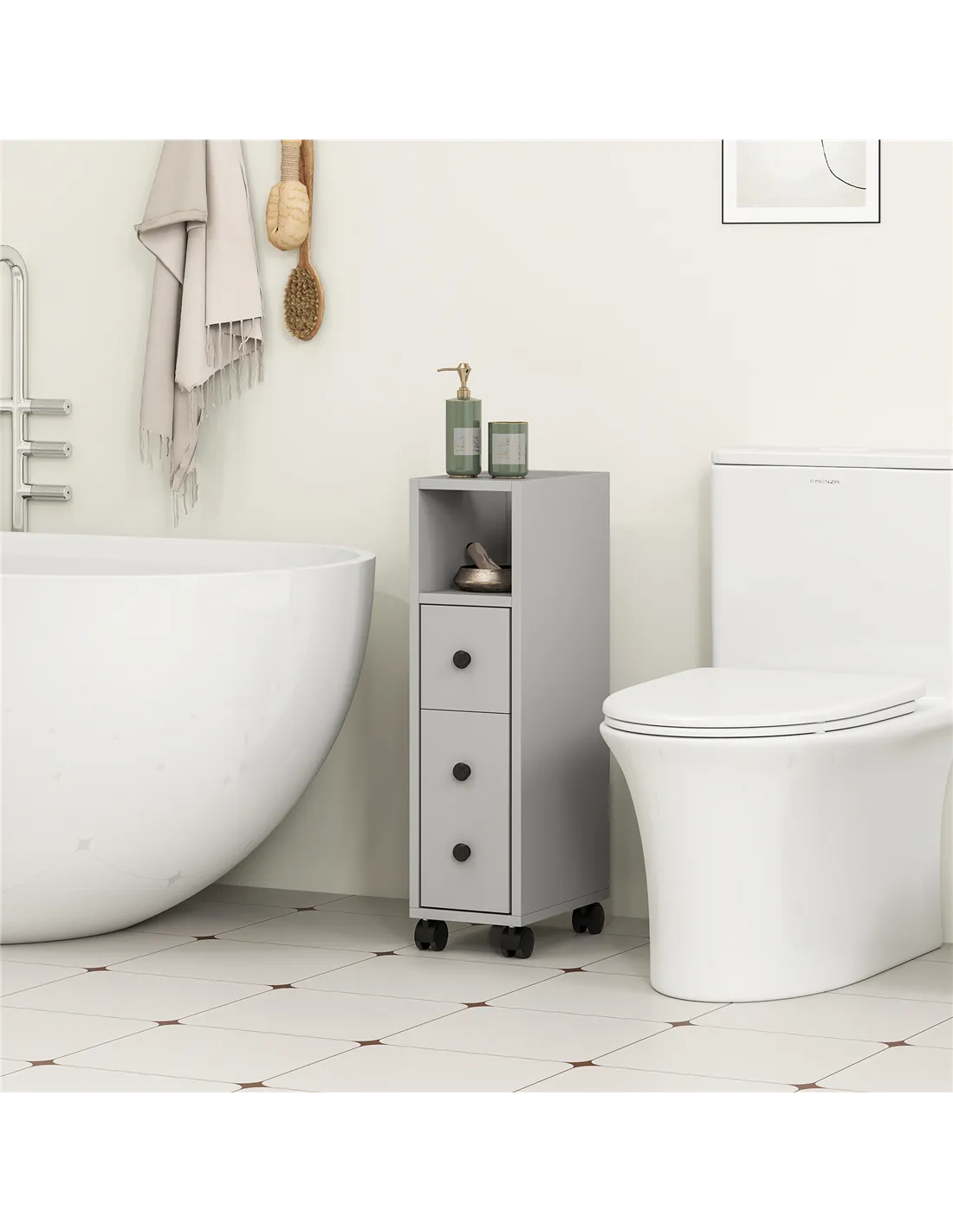 Expand your storage space beautifully with this bathroom cabinet from kleankin. A design which focuses on efficiency and style for homes, it is made with a large bathroom cabinet, a top drawer and two open compartments, giving you a decent amount of storage room. The frame is made from robust particle board to ensure it's suitable for everyday use and its slimline sizing will fit into narrow spots quite easily. Grey all over for a fresh appeal, it's equipped with black handles for a smart contrasting look and is finished with wheels for easy movement.