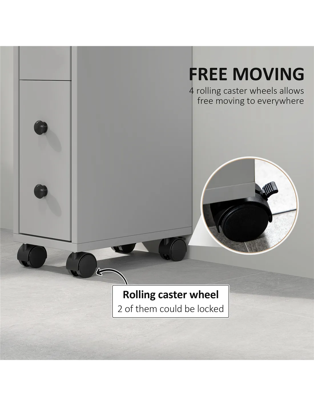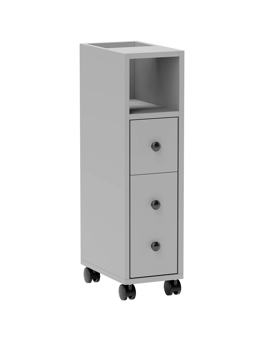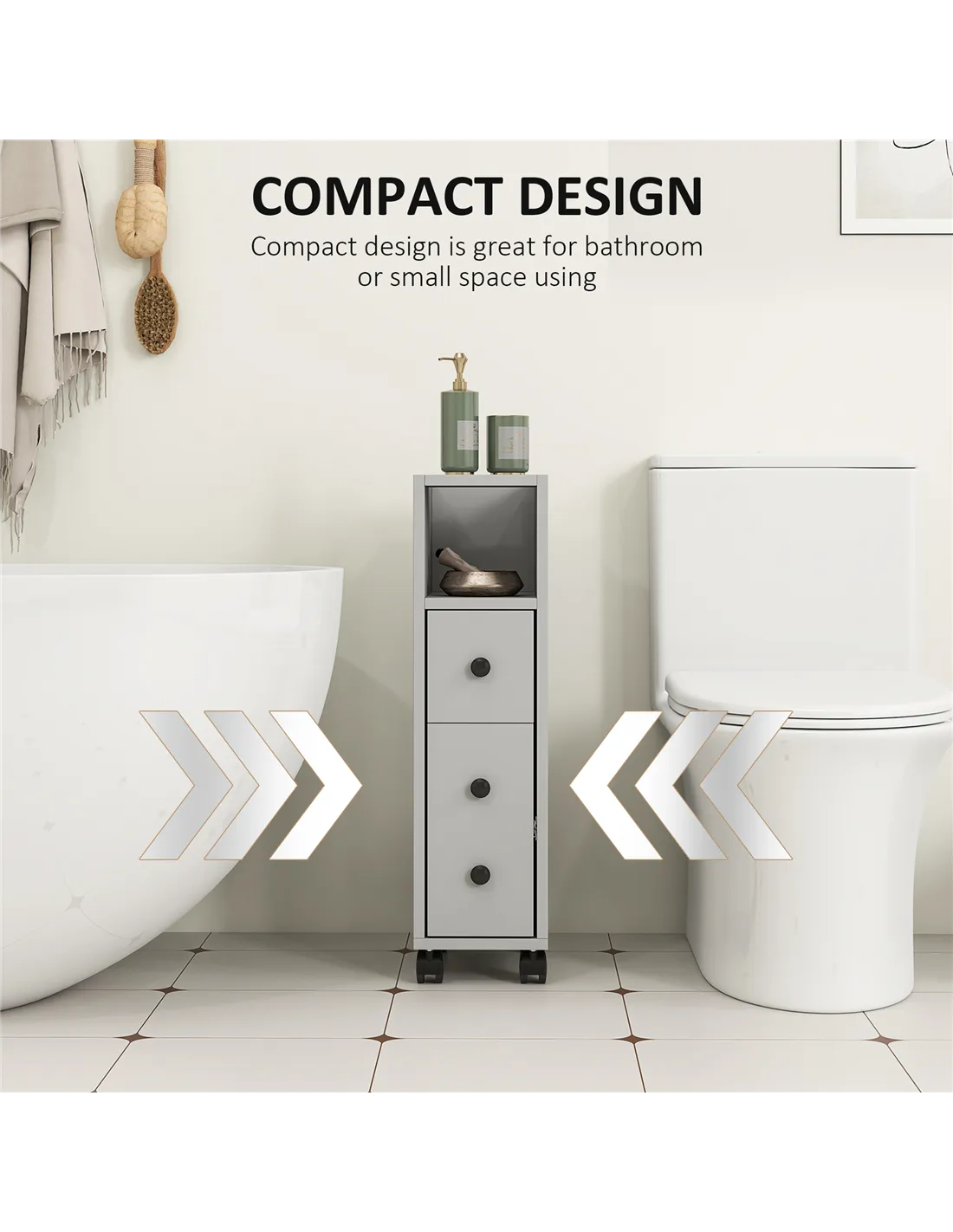 Expand your storage space beautifully with this bathroom cabinet from kleankin. A design which focuses on efficiency and style for homes, it is made with a large bathroom cabinet, a top drawer and two open compartments, giving you a decent amount of storage room. The frame is made from robust particle board to ensure it's suitable for everyday use and its slimline sizing will fit into narrow spots quite easily. Grey all over for a fresh appeal, it's equipped with black handles for a smart contrasting look and is finished with wheels for easy movement.