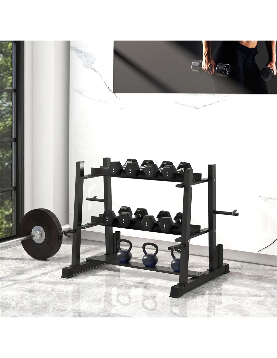 The rack can safely hold up to 200 kg, making it suitable for a wide range of free weights including dumbbells, kettlebells, and plates. - Can the rack accommodate different sizes of kettlebells and dumbbells?
