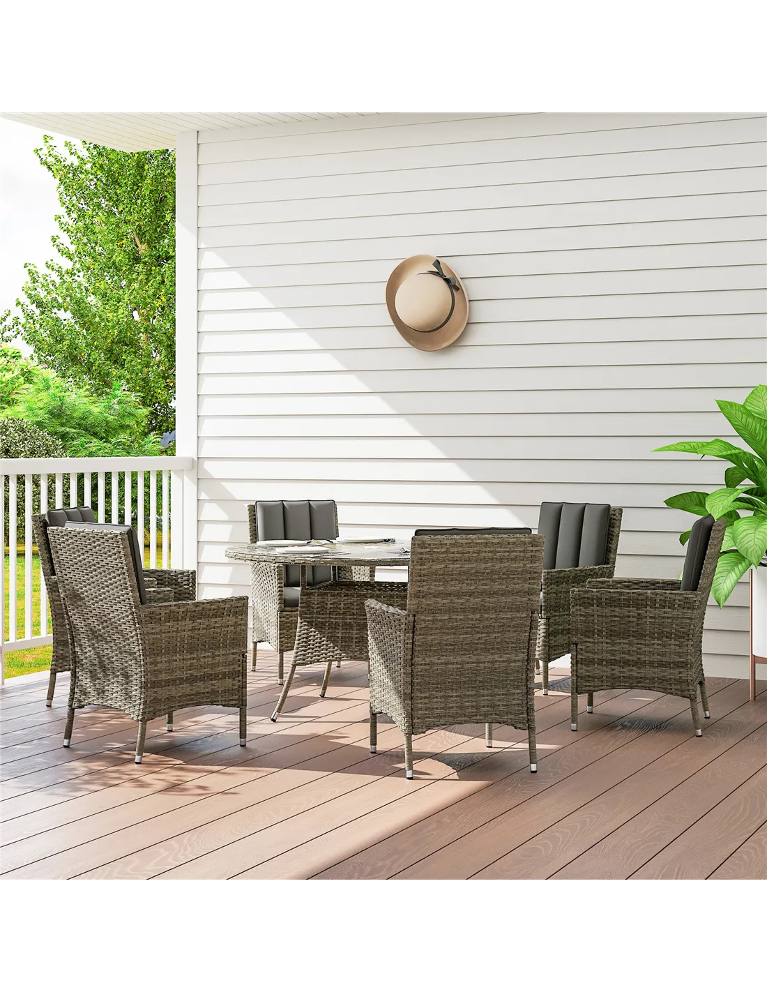Outsunny Seven-Piece Rattan Dining Table, with Round Glass-Top Table - Light Grey