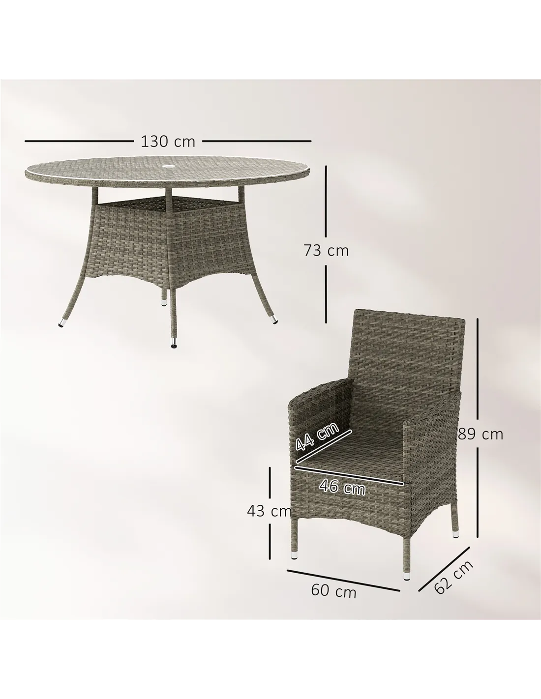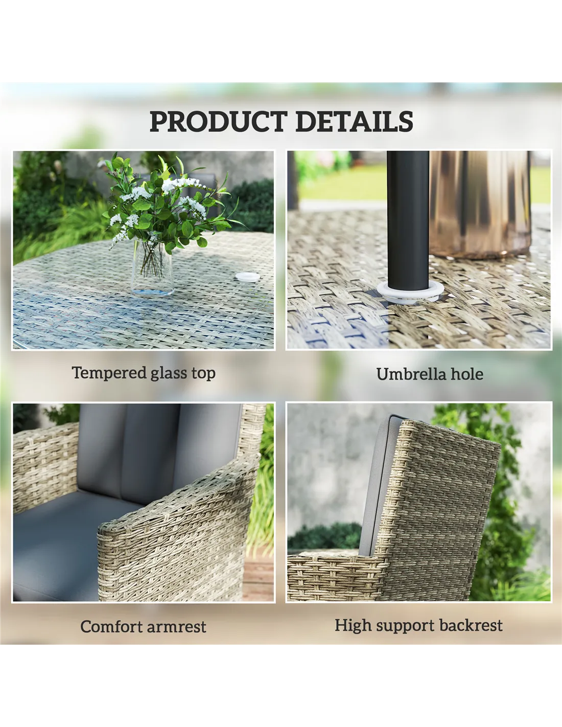 Create a flawless patio with this Outsunny rattan dining set. The powder-coated aluminium frames mean strong frames, wrapped in stylish and protective plastic rattan. The high backs and armrests support your body as you sit, with padded cushions for comfort. The outdoor dining table and chairs set is complete with a glass-top table, with Φ4.2 cm middle hole to hold parasol in place.