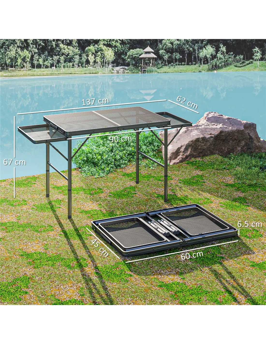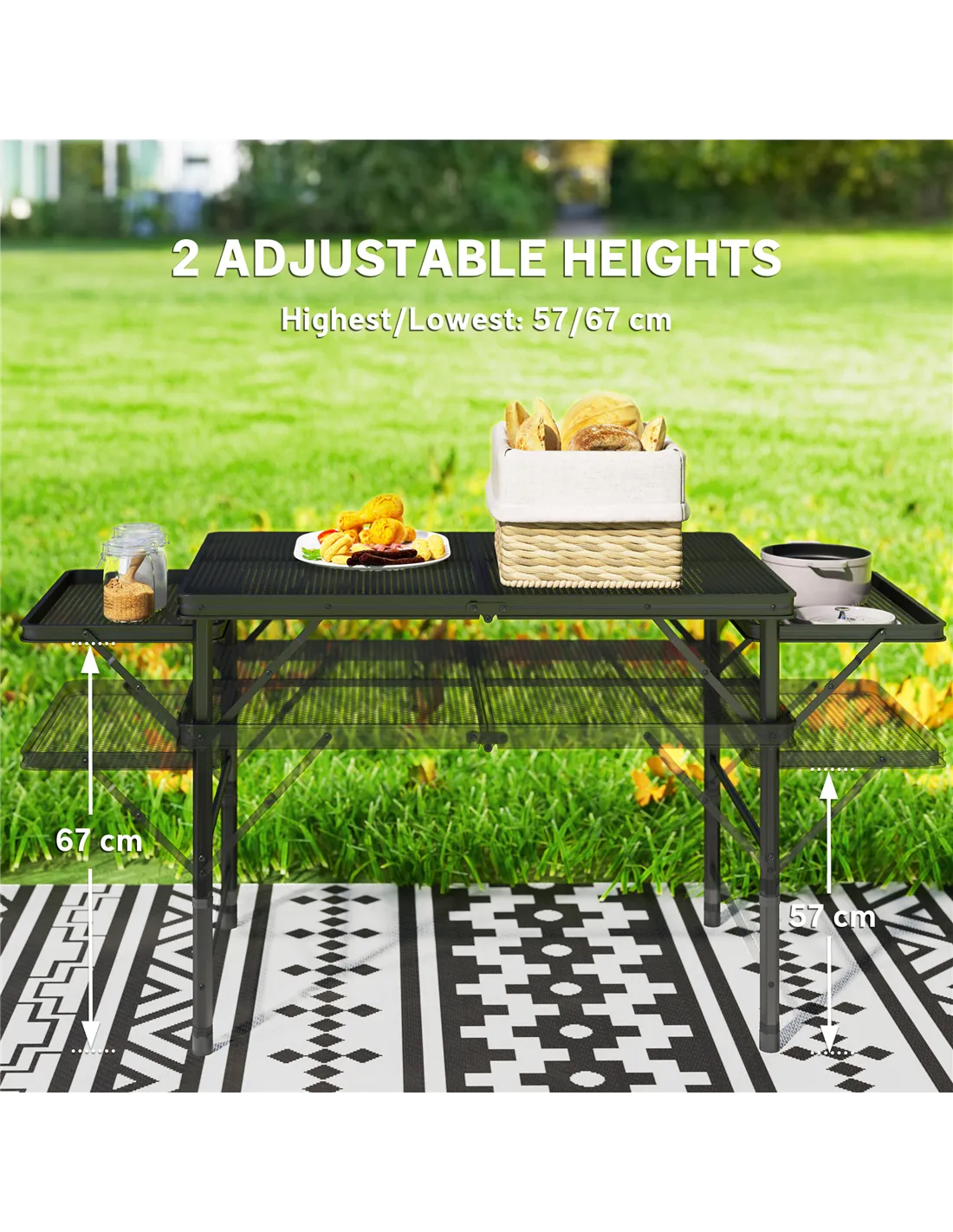Discover the versatility of the Outsunny foldable table, your next must-have for any outdoor gathering. With two foldable side wings, it's great as a garden table or bbq table, offering lots of space for all your essentials. Adjustable height from 57 cm to 67 cm ensures comfort whether you're camping or enjoying a picnic. Plus, its metal grid-designed top is a breeze to keep clean, making it an outdoor favourite!