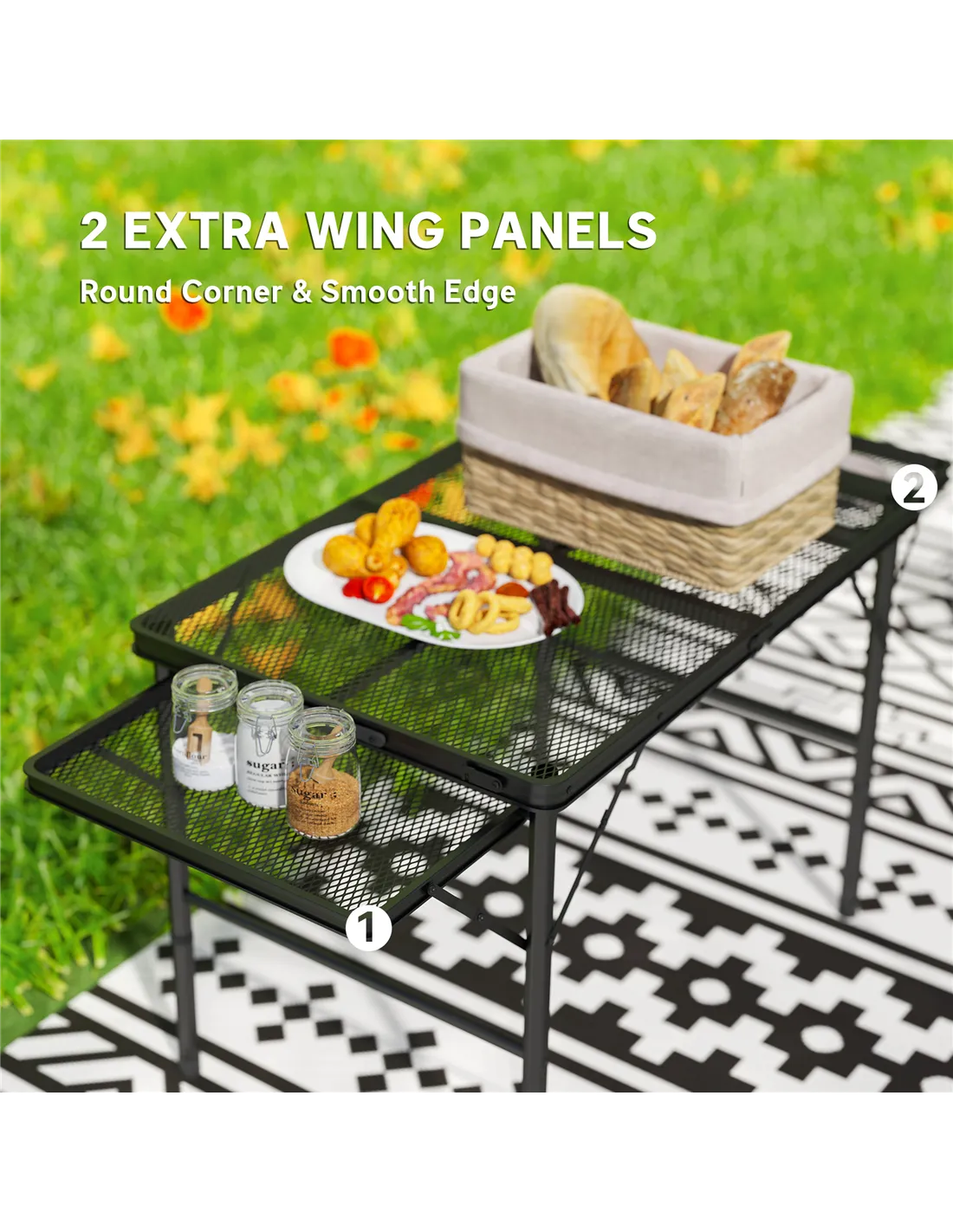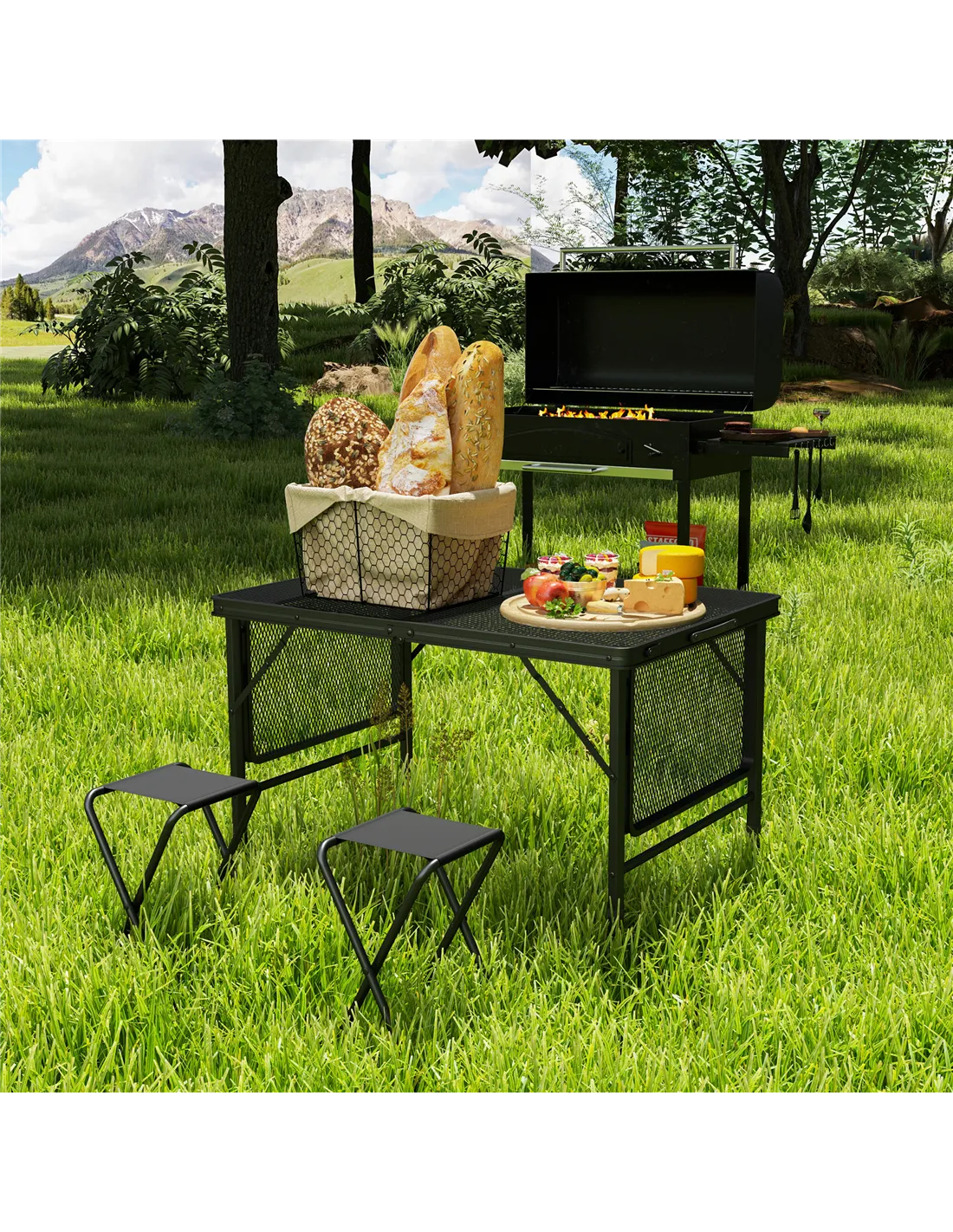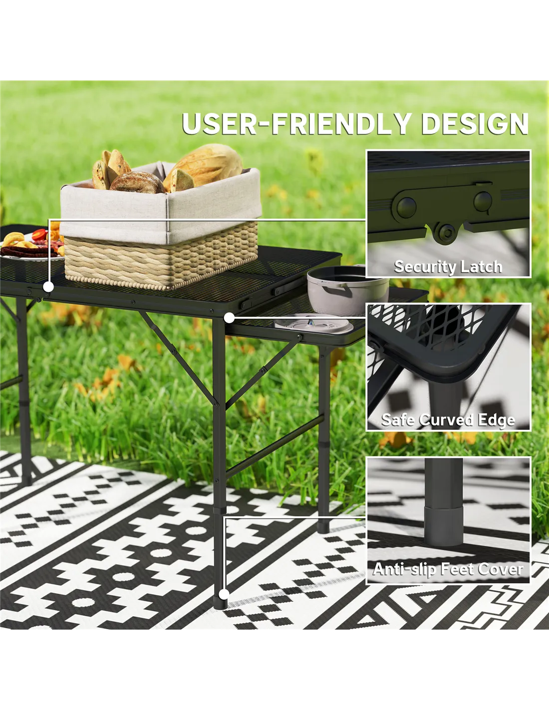 Outsunny Folding Grill Table, 4.5ft Portable Camping Table with 2 Wing Panels, Height Adjustable Metal Picnic Table for Camping, Picnic and BBQ, Black