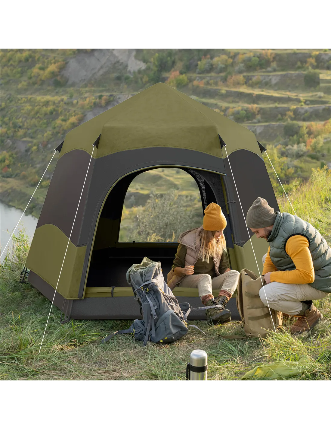 Outsunny Six Man Hexagon Camping Tent with Hang Hook and Carry Bag - Dark Green and Light Grey
